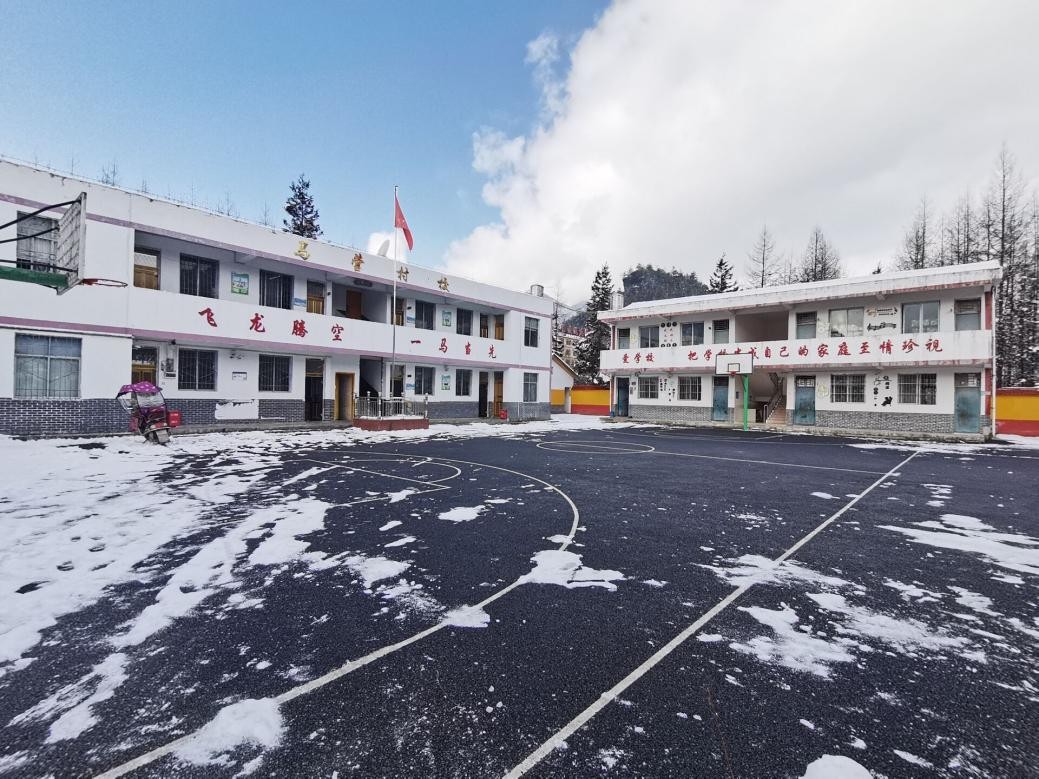 2月24日,在马营村小学老师的陪同下,实践队来到学校进行参观。学校有一栋两层教学楼,每层有两间教室。孩子们正端坐在座位上认真上课。小操场上的积雪还没有完全融化,操场边有篮球架、兵乓球台以及智力玩具乐园等,助力孩子们的全面发展。