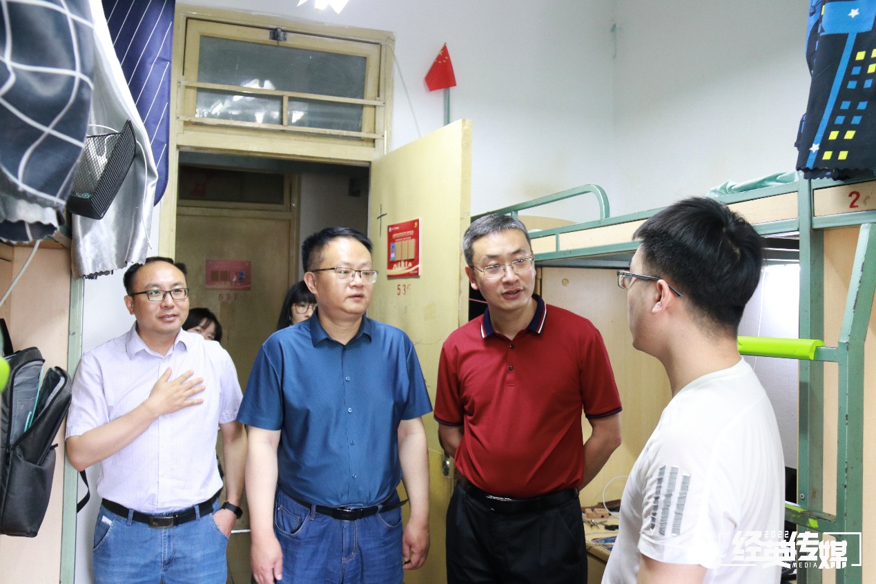 2022年6月1日上午11点,bat365官网登录入口党委书记王斌、执行院长郭强带队,党委副书记杨宏毅、国内合作与校友事务中心副主任张笑芸、学生工作组副组长王哿、贾佳,以及毕业生辅导员薄慧、陈海波、马露露、马俊娇、任永昌等共同走访了九里校区bat365官网登录入口2022届毕业生宿舍,为毕业生们带去美好祝愿。