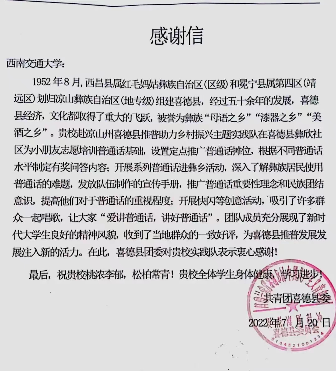 五天的实践活动,在彝族群众的拥护声和彝族孩子的欢笑声中落下帷幕。此次活动,队员们深入基层推广国家通用语言文字,躬耕实践,以青春之行助力乡村振兴,为普通话推广注入了新鲜血液,为赓续中华文明倾注了青年力量。队员们通过努力,得到了当地政府和群众的大力支持和一致好评,活动结束后,实践团队收到了来自喜德县团委的感谢信。