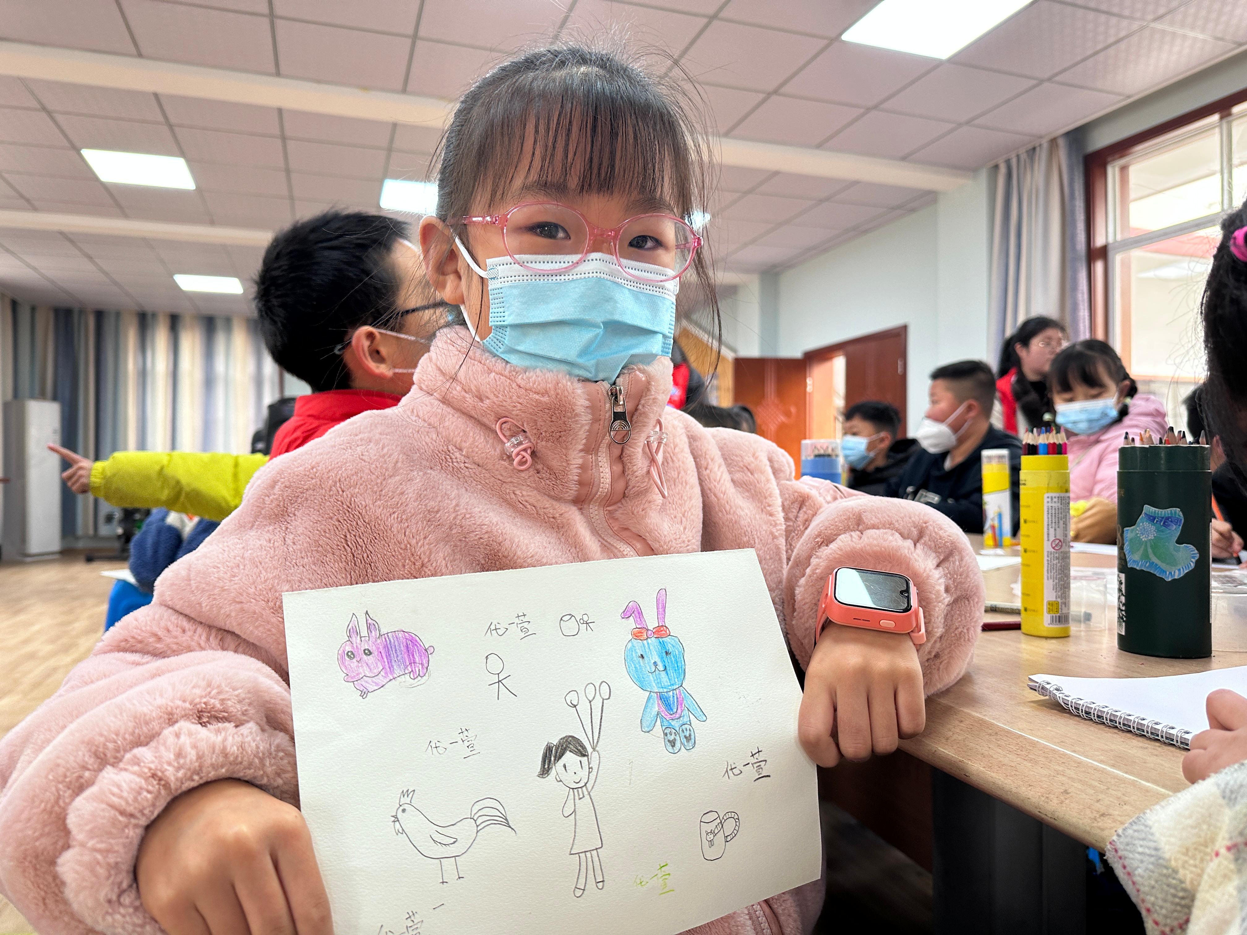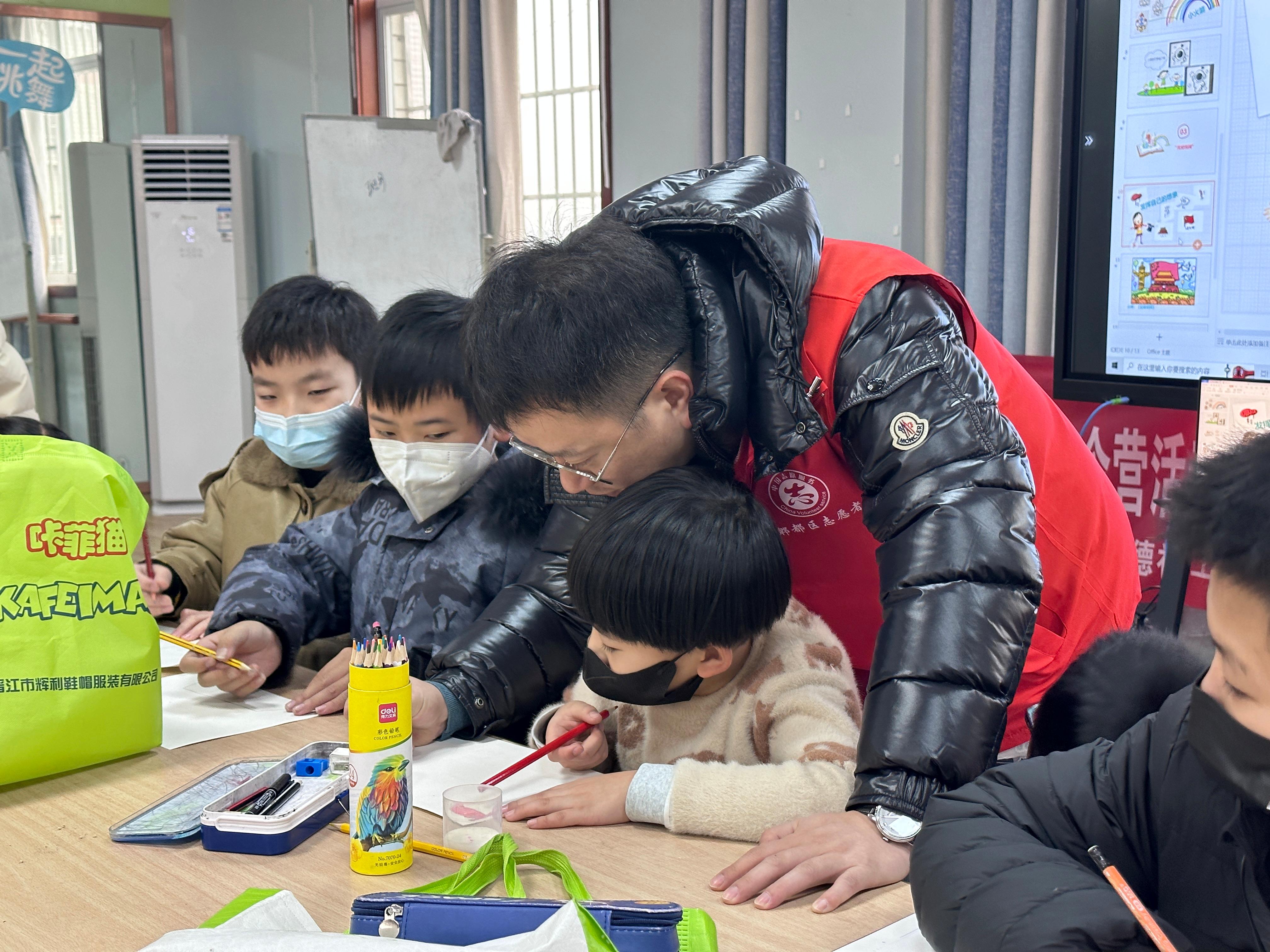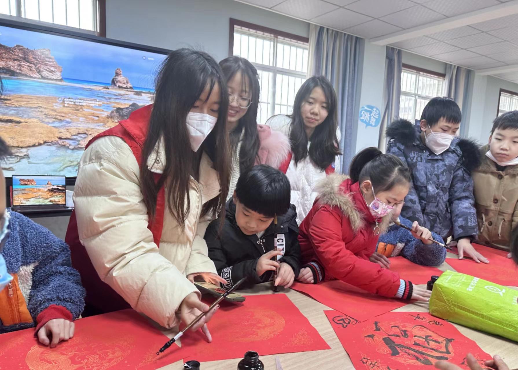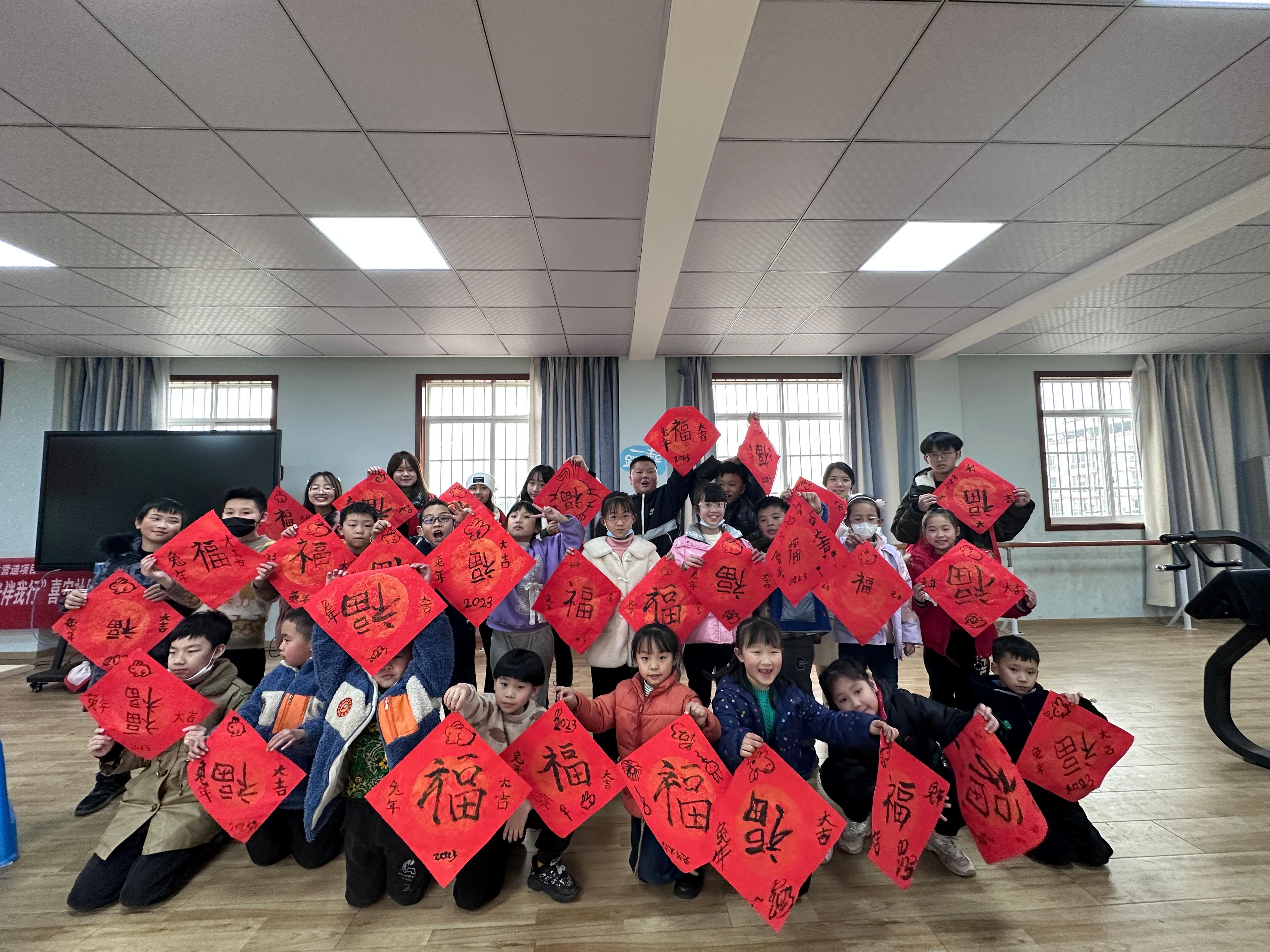 春节是中华民族的传统节日,写“福”字、贴春联则是我们一直延续的民间习俗,表达了人们辟邪除灾、迎祥纳福的美好愿望。趣味课堂结束后,志愿者带着孩子们认识对联和“福”字,学习对联的组成和对仗写法,在感受新春氛围的同时,了解中华传统文化,随后,志愿者与孩子们一起裁红纸、写“福”字,引导孩子们尝试设计不同字体,不仅锻炼了动手动脑能力,也让他们体验到民间文化艺术带来的乐趣。