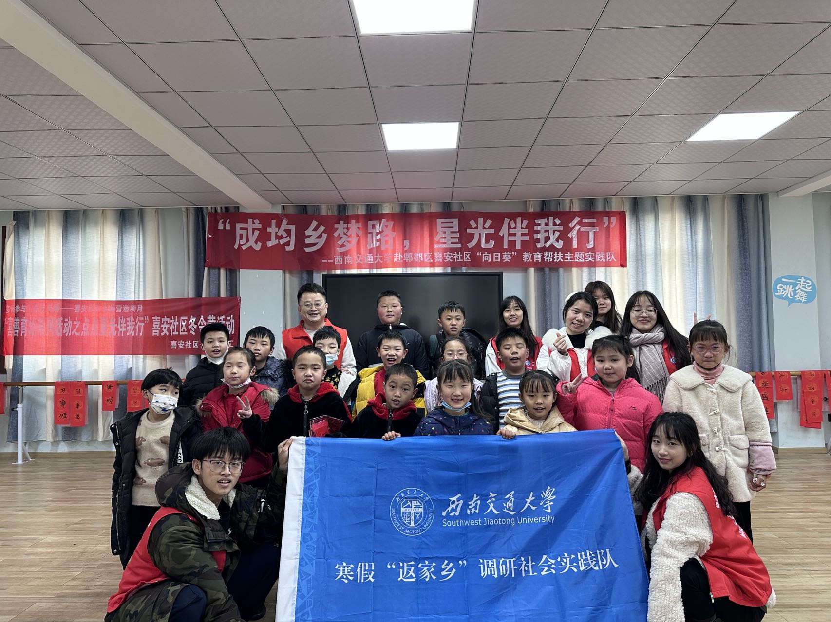 为充分发挥“社会实践作为加强和改进大学生思想政治教育重要途径”的作用,让大学生在实践中长知识、增才干,进一步坚定走中国特色社会主义道路的理想信念,bat365官网登录入口“向日葵”寒假“返家乡”志愿服务队联合郫都区安靖街道喜安社区居委会于1月9日走进社区,开展为期5天的“成均乡梦路,星光伴我行”教育帮扶主题社会实践活动。通过开展趣味课程、文化活动、走访送福等形式,助力基层服务,弘扬中华文化,凝聚青年力量。