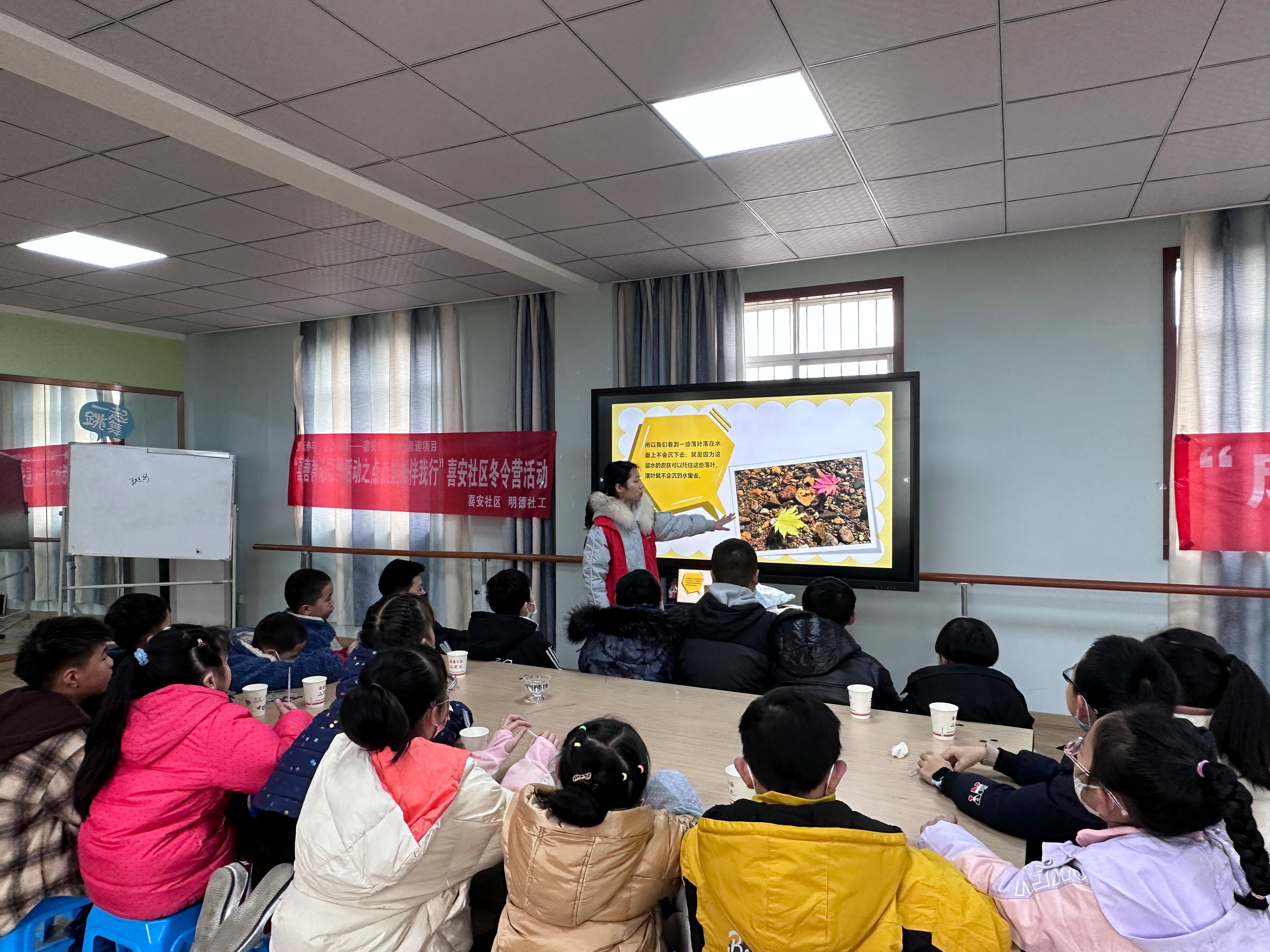 实践活动前三天,志愿者们在社区的帮助下,充分发挥各自的特长优势,丰富辖区儿童的假期生活,通过“宇宙大爆炸”科普知识课堂、音乐之声欣赏课、“看见寒冬"美术课、户外素质拓展课、“每日职业”课、电影欣赏课等趣味课程,拓展了孩子的知识面,锻炼了他们思维和动手能力。科普课上,志愿者们寓教于乐,采用孩子们感兴趣的教学形式,让他们学习到电力、太阳系和水张力的知识;职业体验课上,志愿者们带领孩子们更全面地了解了警察、法官等职业,鼓励小朋友大胆憧憬自己的职业梦想;户外素质拓展课上,通过一起做游戏、做手工等各类文体娱乐活动,享受动手带来的乐趣;音乐课上,大家合唱《童年》,学习乐理知识,欣赏了音韵之美的同时又增进了彼此的感情;观影课上,共同欣赏电影《海蒂与爷爷》,引导孩子们从主人公海蒂身上学习善良、坚强的品质。