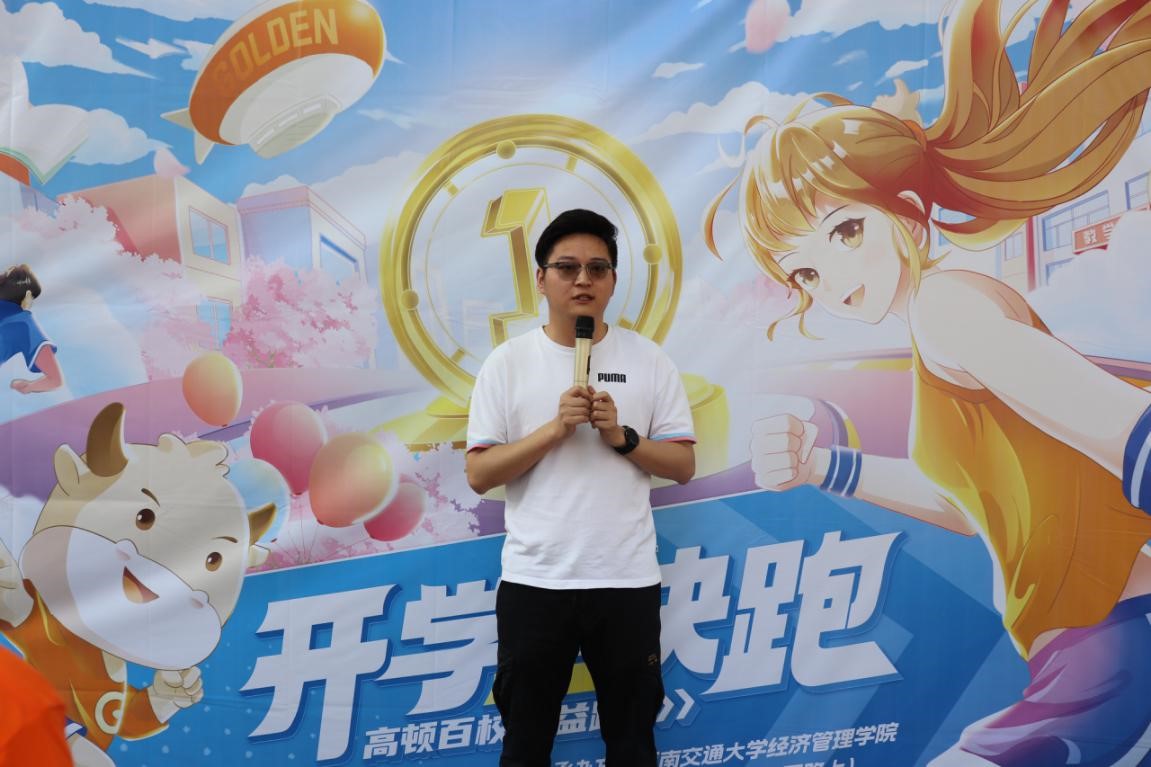 活动伊始,由高顿教育成都分校校长覃庆节致辞。他指出高顿校园公益跑旨在连接更多大学生,将大家的实际行动化为涓涓细流注入公益事业,为西部困难儿童捐赠爱心书籍,助力他们点亮梦想,覃校长也感谢了西南交通大学bat365学院对本次活动的支持,希望同学们可以保持对运动的热情、提高对公益事业的支持。