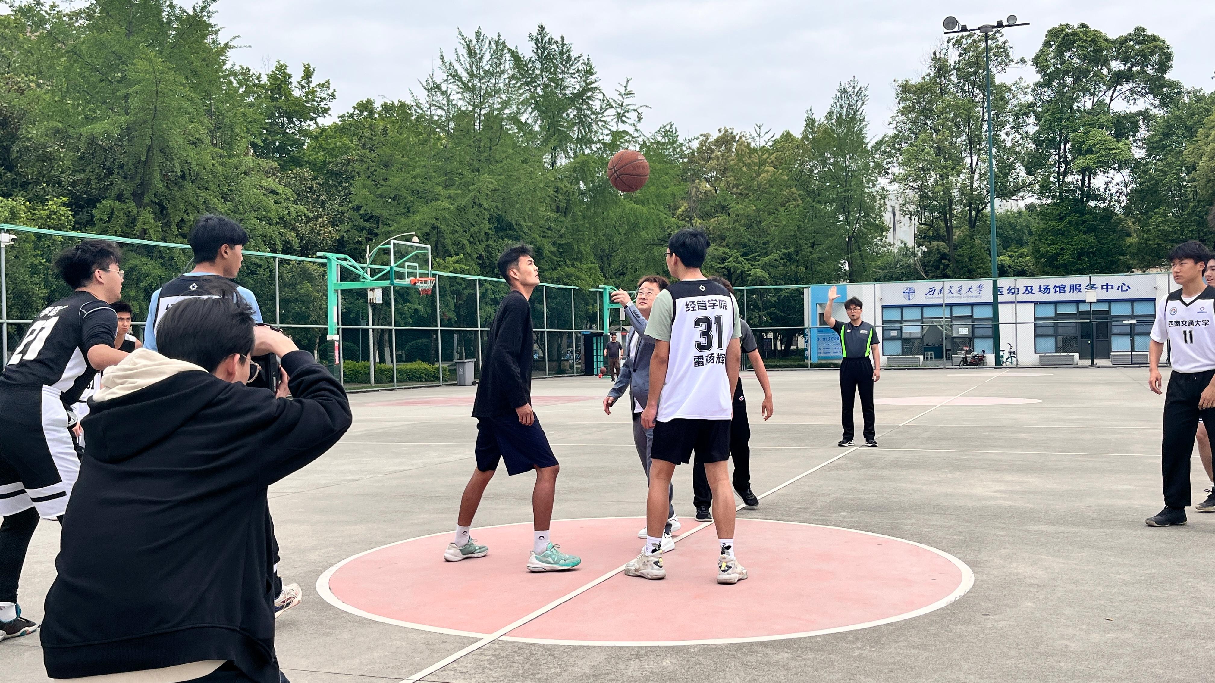 2023年4月24日中午,bat365官网登录入口2023年“bat365杯”篮球赛开幕式暨揭幕战在九里校区篮球场举行。bat365官网登录入口党委副书记杨宏毅老师,分团委副书记、青年志愿者协会指导老师、2020级辅导员陈建奇老师,计财处助理团指导老师、2021级辅导员莫代玉老师,青年建设中心指导老师、2019级辅导员安静泽老师,研究生辅导员卢婧茹老师,研究生辅导员任永昌老师出席了本次开幕式。