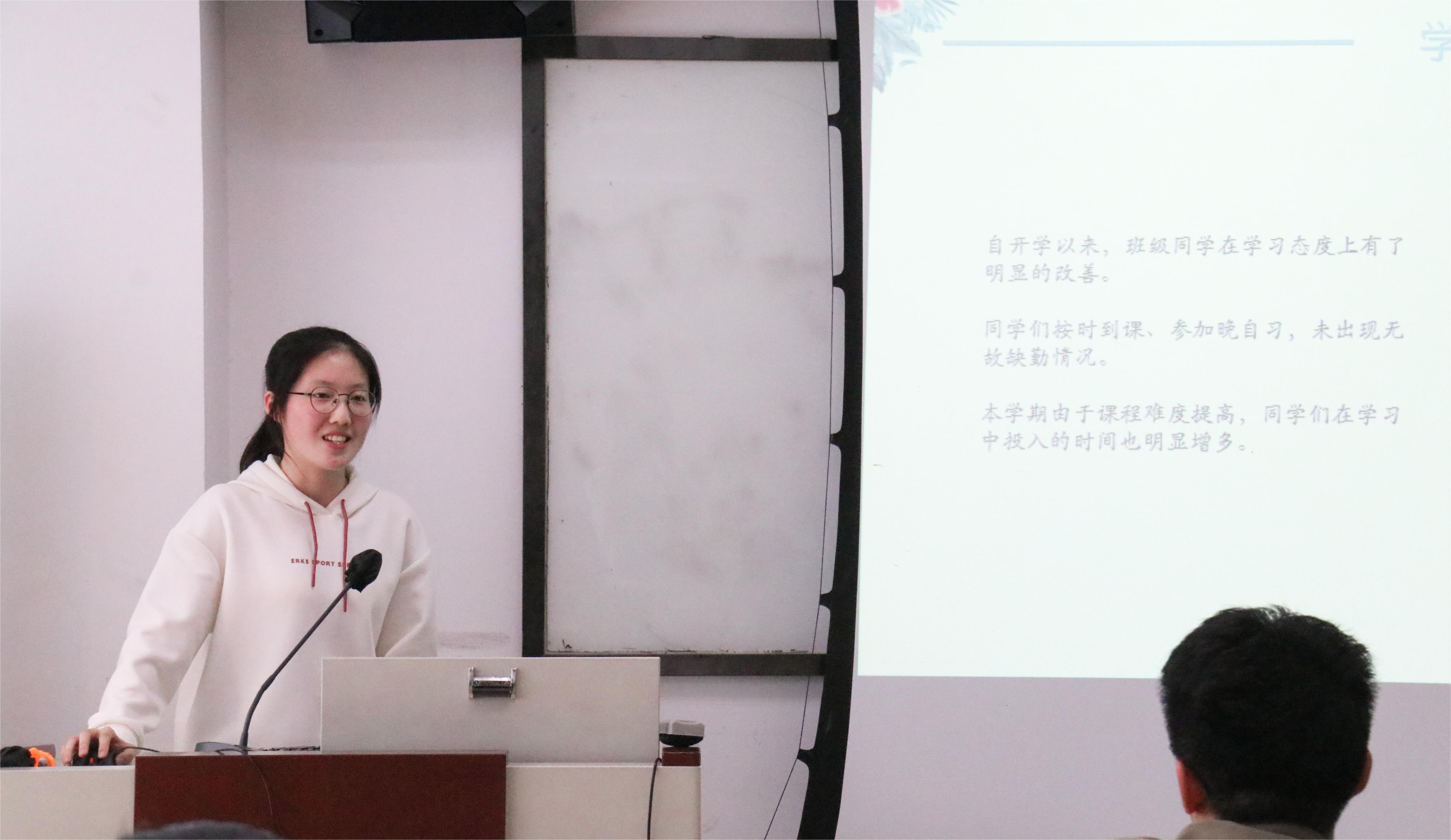 随后,各班学习委员依次上台展示班级学风建设与成绩分析。学委们从学习状态、学习风气、日常工作等方面,结合班级上学期学习成绩,对同学们入校以来的学习生活进行了总结分析,并重点对存在的问题做出了阐述,如:晚修难以坚持、成绩两极分化、上课态度散漫、存在学习焦虑等。在提出问题的同时,各班学委也积极分享经验,讲述了自己在学风建设中的思考与理念,如建设学习交流群、开展学习打卡等,相互取长补短,讨论如何把班级学风建设工作落到实处。
