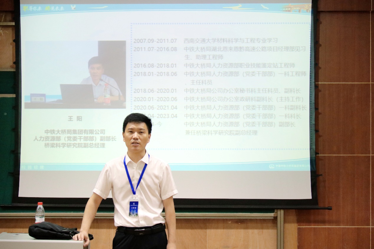 接着,我校优秀校友王阳回忆了自己的个人成长经历。他从三个方面介绍了自己加入中铁大桥局的理由:1.集团能够为大家提供强大的优秀的平台,比如国家重点实验室和超级工程等;2.能够为大家提供良好的成长环境,如完善的培养体系、特色的培养机制和综合实力强劲的合作伙伴;3.加入中铁大桥局会有优秀的师兄师姐做榜样,在成长过程中提供无微不至的关怀和帮助。