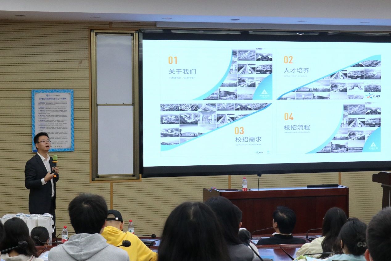 随后,景权仪详细介绍了本次招聘计划。他分别从公司信息、人才培养、校招需求、校招流程四个方面重点介绍。他首先提到,中建咨询历史悠久,走在国家经济发展前端,由中国建筑西南设计研究院、成都轨道交通集团、成都高新投资集团合资成立;第二,强调了公司对待人才的重视程度,公司建立了完善的人才评定体系,着重培养各方向专业人才,积极链接外部人才,拉长产业链,做大产业圈,强化产业链互动等;第三,中建咨询公司内部具有完善的晋升制度,晋升发展通道畅通,发展选择多样,可满足多样化职业规划,全职业生涯发展;第四,提醒投递简历的同学,提前完成中建集团的网上测试,以免造成不便。