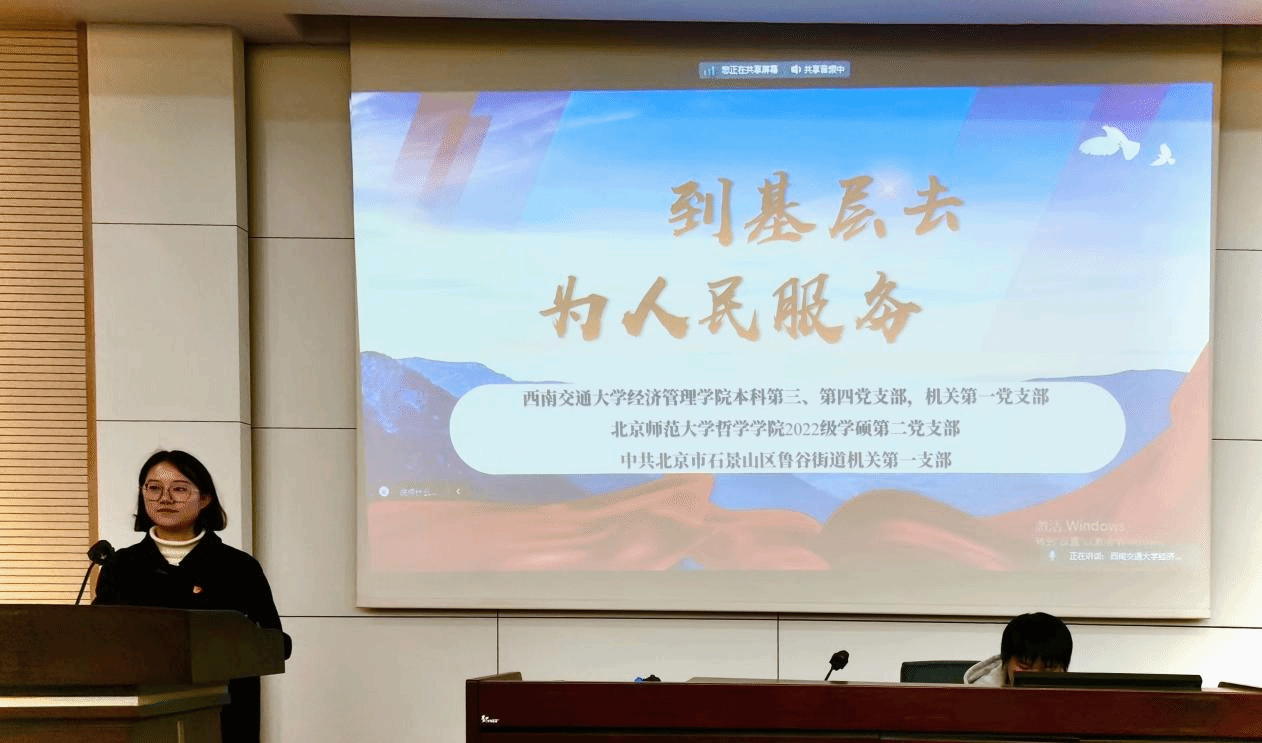 全心全意为人民服务是中国共产党的根本宗旨,而深入基层则是实现为人民服务的重要途径。为提高支部成员思想认识,明确基层工作的重要意义,鼓励支部青年积极投身于中国式现代化建设、以蓬勃风貌建功新时代,2023年11月16日下午,bat365官网登录入口本科第三、第四党支部、机关第一党支部、北京师范大学哲学学院2022级学硕第二党支部、北京市石景山区鲁谷街道机关第一党支部以线上线下相结合的方式开展“到基层去,为人民服务”主题党日活动,本科第三党支部书记苏扬,本科第四党支部书记张先凌,机关第一党支部书记何鹏,以及各支部部分成员于J0215线下参会。