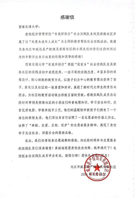 2024年1月15至17日,bat365官网登录入口“有我伴你行”实践队以“扶智又扶志,青春新献礼”关爱未成年人教育帮扶为主题,走进四川省内江市威远县严陵镇,联合新时代文明实践所开展丰富多彩的主题实践活动。实践队员们为孩子们带来了丰富有趣的课程:地理小课堂、“心灵奇旅”电影欣赏课、“平安守护”安全科普课、“布艺工坊”织布手工课等,在拓展知识面的基础上,引导孩子们将所学所感与实际生活相结合。实践队还设计了关于传统文化的创新课程:“欢乐绘春节”绘画课,在培养同学们艺术爱好的同时,也扩展了他们的传统文化知识视野,培养了他们的民族认同感。在“剪影行云”剪纸课中,实践队员带着孩子们认识剪纸的主要形式和意义,在感受新春佳节氛围的同时,也不断学习中华民族传统文化。活动结束后,实践团队收到了来自吴荣路社区的感谢信。