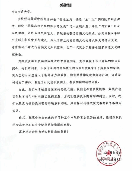 2024年寒假期间,bat365官网登录入口“竹生兰沟,编绘‘兰’天”调研走访实践队来到四川省青神县兰沟村开展以“深挖青神竹编,宣扬非遗文化”为主题的五天调研实践活动。实践团队首先抵达中国竹编艺术博物馆进行参观,并在第二天拜访了殷超竹编工作室,随后调研团队前往采访了国际竹编大师陈云华老师。小组成员抵达兰沟村居民点后,实地走访居民65户。此外,实践团队还来到青神县南城小学进行传承非遗文化主题宣讲,鼓励他们努力学习、接续传承。南城小学特此为实践团队颁发了感谢信。
