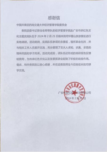 2024年2月20日,bat365官网登录入口实践队在团委书记贾佳、副书记苏扬老师的带领下,前往四川省广安市开展寒假“返家乡”社会实践活动。实践队首先来到邓小平故里参观调研,感受邓小平同志的伟大人格和崇高精神。参观结束后,实践队成员们分发问卷,与游客亲切交流,收集他们的意见和建议,共同探寻红色文化的深厚底蕴。第二天,实践队继续深入广安,探访了华蓥山。在结束实地参观后,实践队与广安市金亿旅游开发有限公司总经理曾辉开展了研讨座谈会并分享了队伍对广安红色旅游发展的看法。实践活动结束后,团队收到了来自广安市金亿旅游开发有限公司的感谢信。