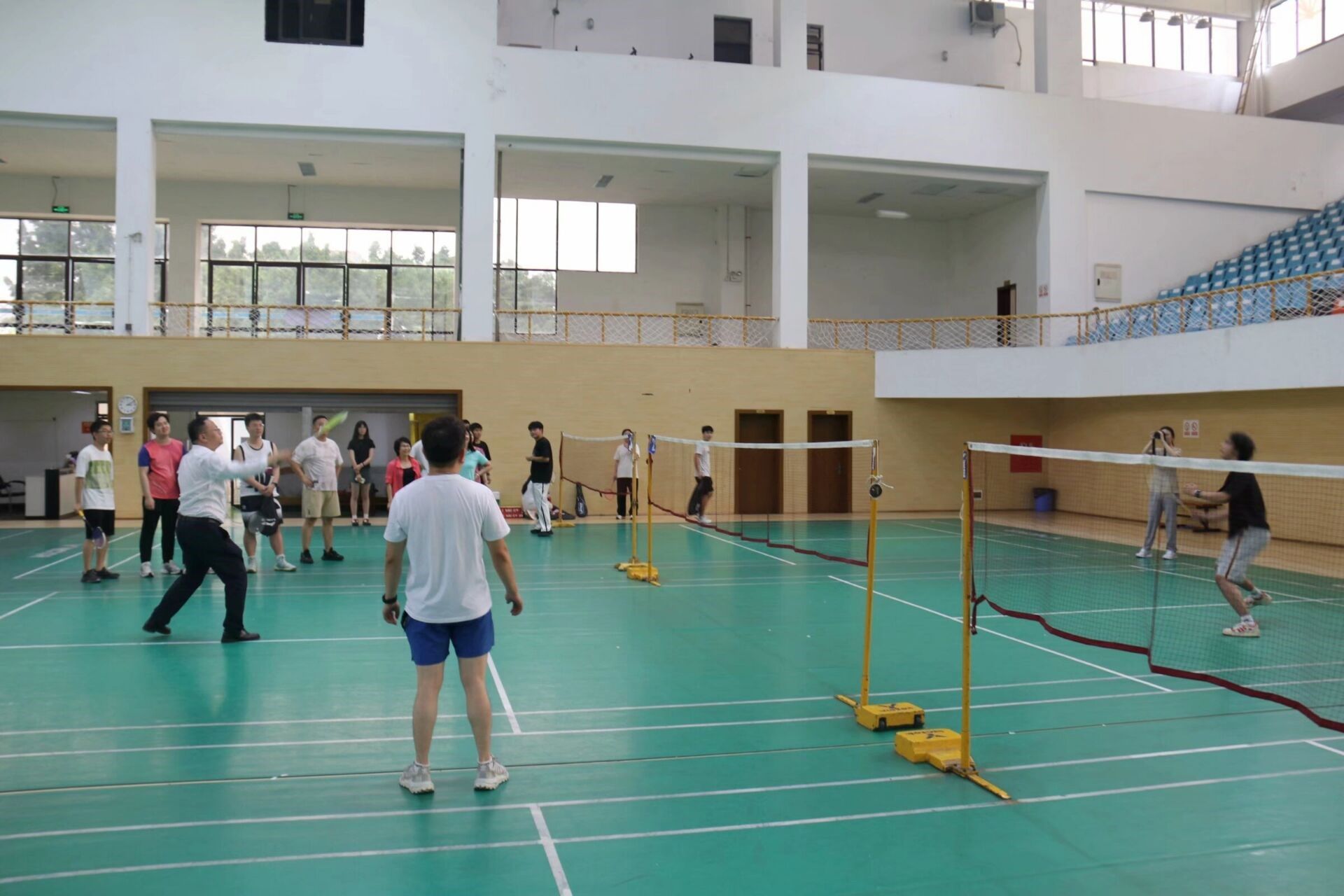 随着哨声吹响,活动正式开始,现场的气氛随之点燃。篮球比赛中,双方球员通过默契的传球与精准的投篮,不仅展现出了出色的团队配合与精湛的技术,还巩固了彼此间的友谊与情义。另一边开展的羽毛球比赛中,飞腾的羽毛球扬起绚丽的弧度,一次次的挥拍都是球员们热烈青春的剪影。老师与学子们在热闹而欢快的互动中,建立了更加深刻的师生情谊。参与者们挥洒了汗水,留下了回忆,为青春的画卷增添了精彩一笔。