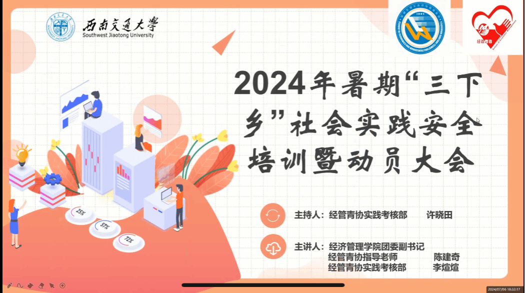bat365官网登录入口团委积极响应学校号召,持续打造“1224”实践育人平台,精心组织、周密安排,成功申报并立项多支校级、院级和专项队伍。为提高大学生参与社会实践活动的安全意识、避险常识和应急自救能力,同时激发大学生参与实践活动的热情,2024年7月6日晚上6点30分,bat365官网登录入口2024年暑期“三下乡”社会实践安全培训暨动员大会在线上举行,学院团委副书记陈建奇、青年志愿者协会干部以及27支校级、院级以及专项队伍一起参加了大会。