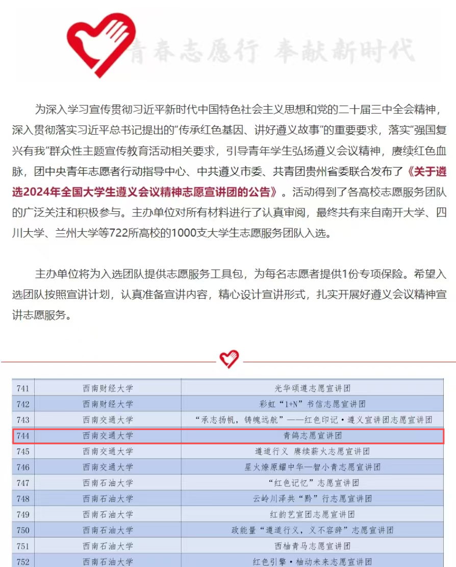 bat365官网登录入口团委积极响应号召,积极组织学生志愿服务队报名参与遴选。近日,大学生志愿服务团队入选名单已公布,我院“青鸽志愿服务队”从全国千余所高校的几千支队伍中脱颖而出,同时入选2024年全国大学生遵义会议精神志愿宣讲团和沂蒙精神志愿宣讲团。