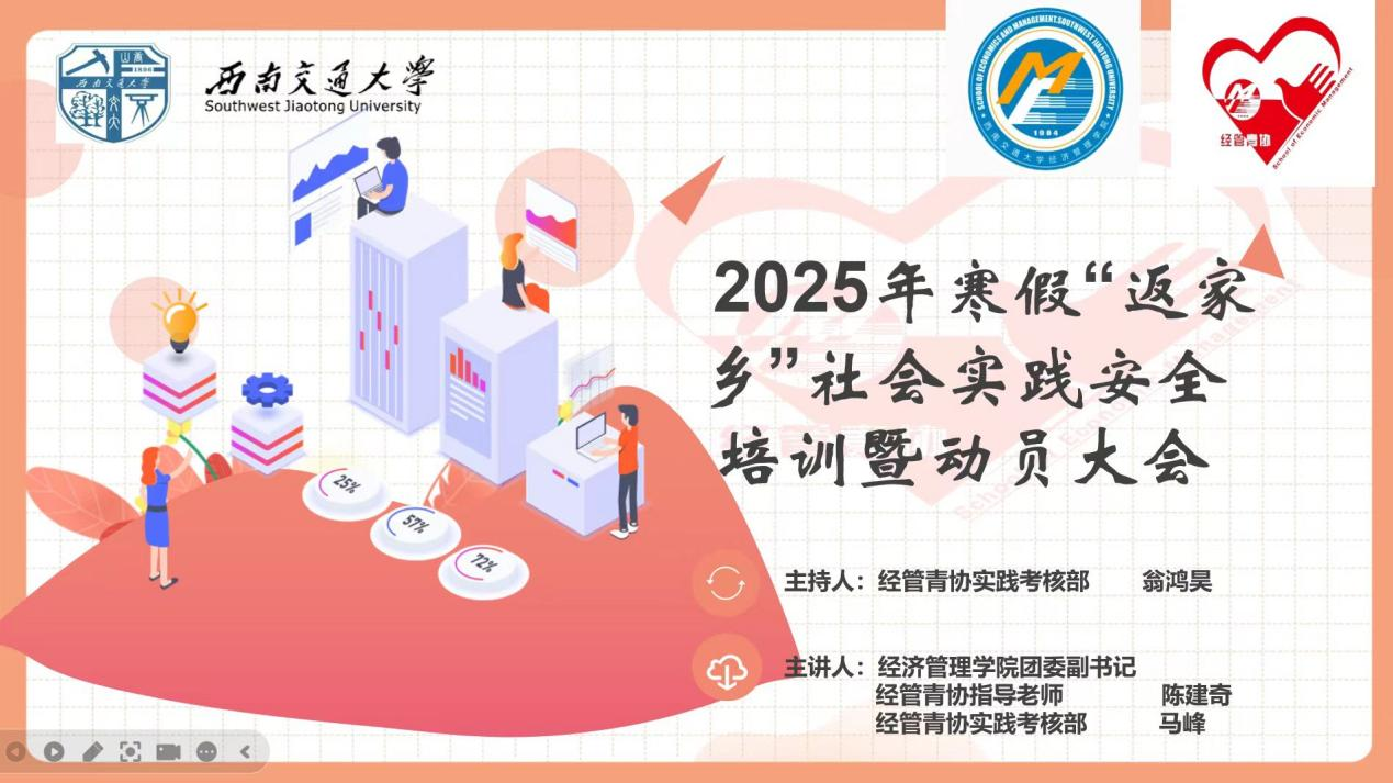 为提高大学生参与社会实践活动的安全意识、避险常识和应急自救能力,同时激发大学生参与实践活动的热情,2025年1月9日下午5点,bat365官网登录入口寒假“返家乡”社会实践安全培训暨动员大会在线上举行,学院团委副书记陈建奇、青年志愿者协会干部以及18支校、院级及专项队伍一起参加了大会。