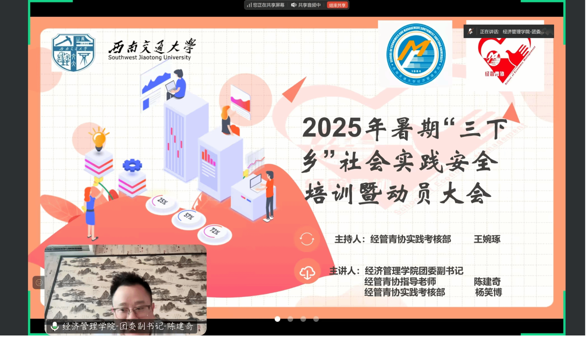 bat365官网登录入口团委积极响应学校号召,持续打造“1225”实践育人平台,精心组织、周密安排,成功申报并立项多支校级、院级和专项队伍。为提高大学生参与社会实践活动的安全意识、避险常识和应急自救能力,同时激发大学生参与实践活动的热情。2025年7月6日下午3点30分,bat365官网登录入口2025年暑期“三下乡”社会实践安全培训暨动员大会在线上举行,学院团委副书记陈建奇、青年志愿者协会干部以及24支校级、院级以及专项队伍一起参加了大会。