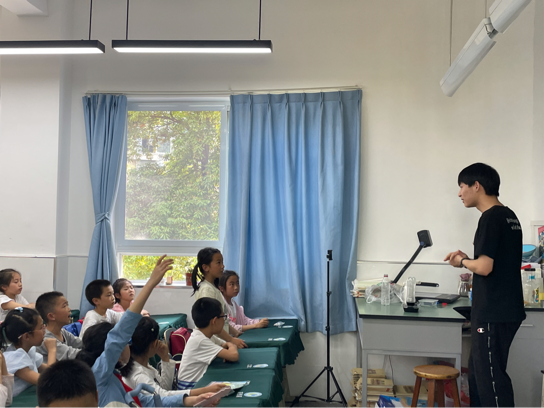 活动第二部分以科学为主题,由王丹同志向小学生们展示了科学小实验——“会爬升的水”。在实验后介绍了相关原理,小朋友们也积极地提出和回答问题,举例生活中自己感受到的气压,例如吸管喝水、吹气球、坐飞机等等。在做了一遍实验示范后,王丹同志邀请了一位小朋友亲自进行实验,共同感受实验的乐趣。