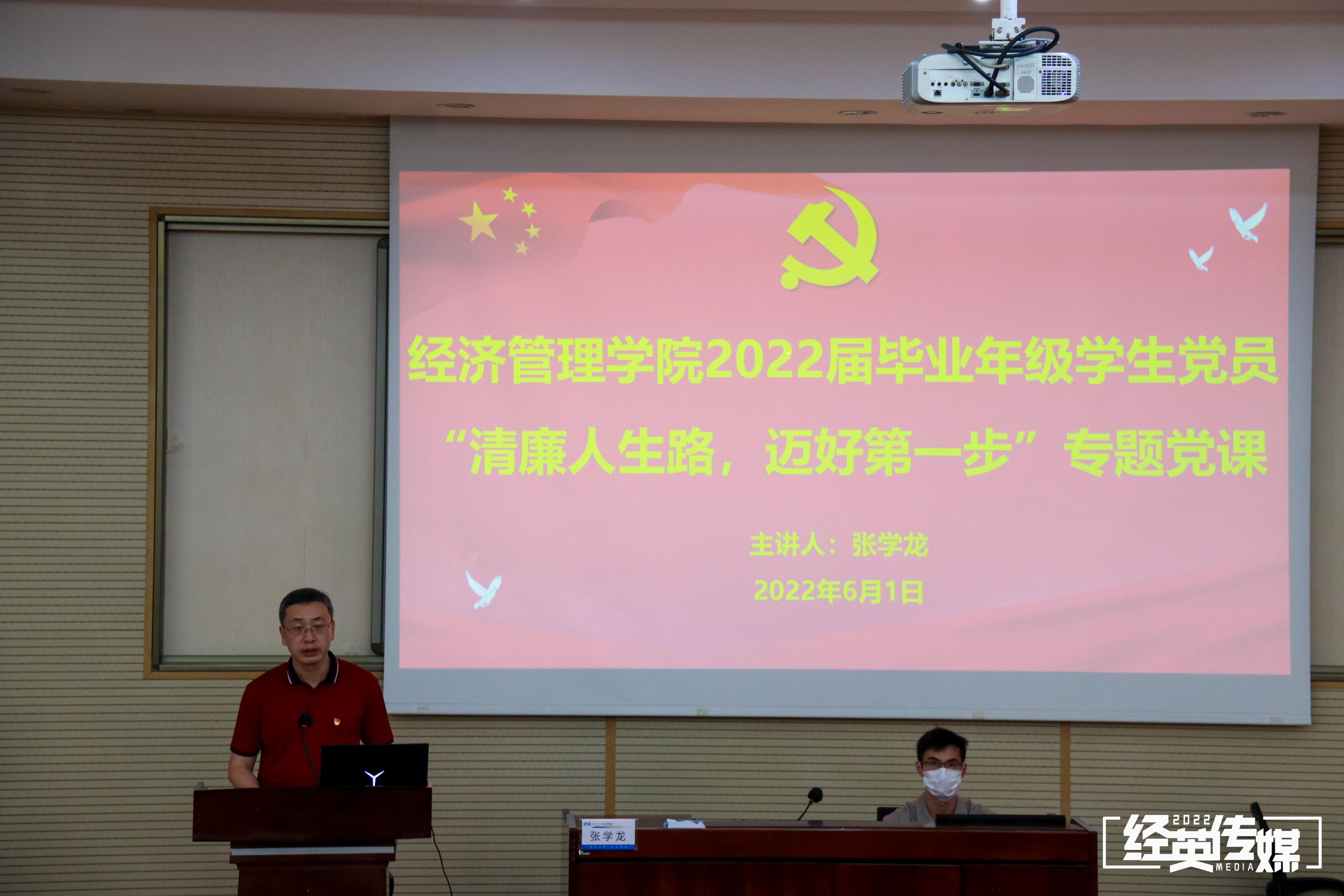 2022年6月1日下午2:30,为了进一步筑牢党员的初心与使命,bat365官网登录入口党委邀请学校党委副书记、纪委书记张学龙在九里校区0202教室为学院2022届毕业年级学生党员讲授“清廉人生路,迈好第一步”专题党课。党课由学院党委书记王斌主持,学院党委副书记夏显波、杨宏毅,学生工作组全体辅导员及毕业年级学生党员参加了党课学习。