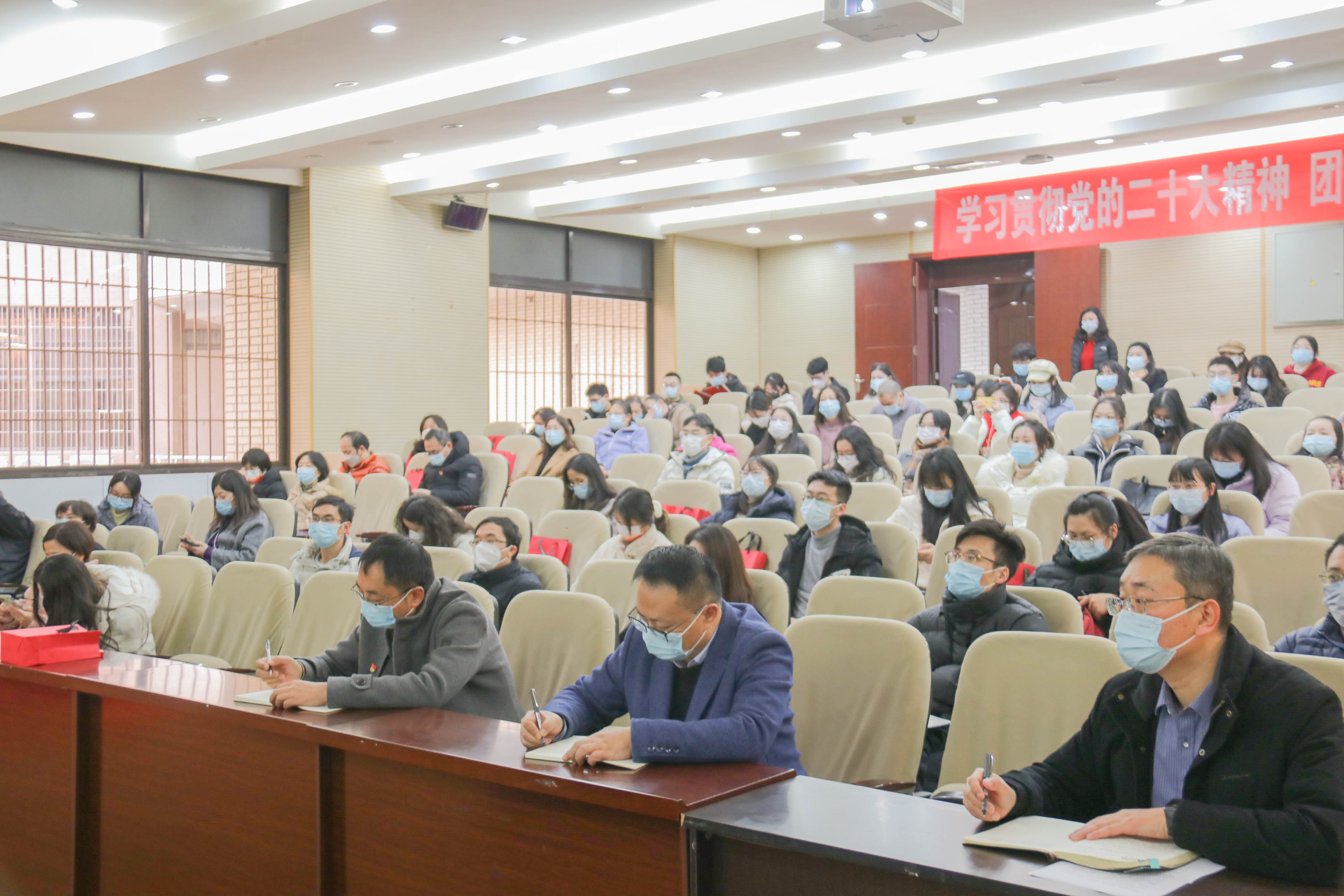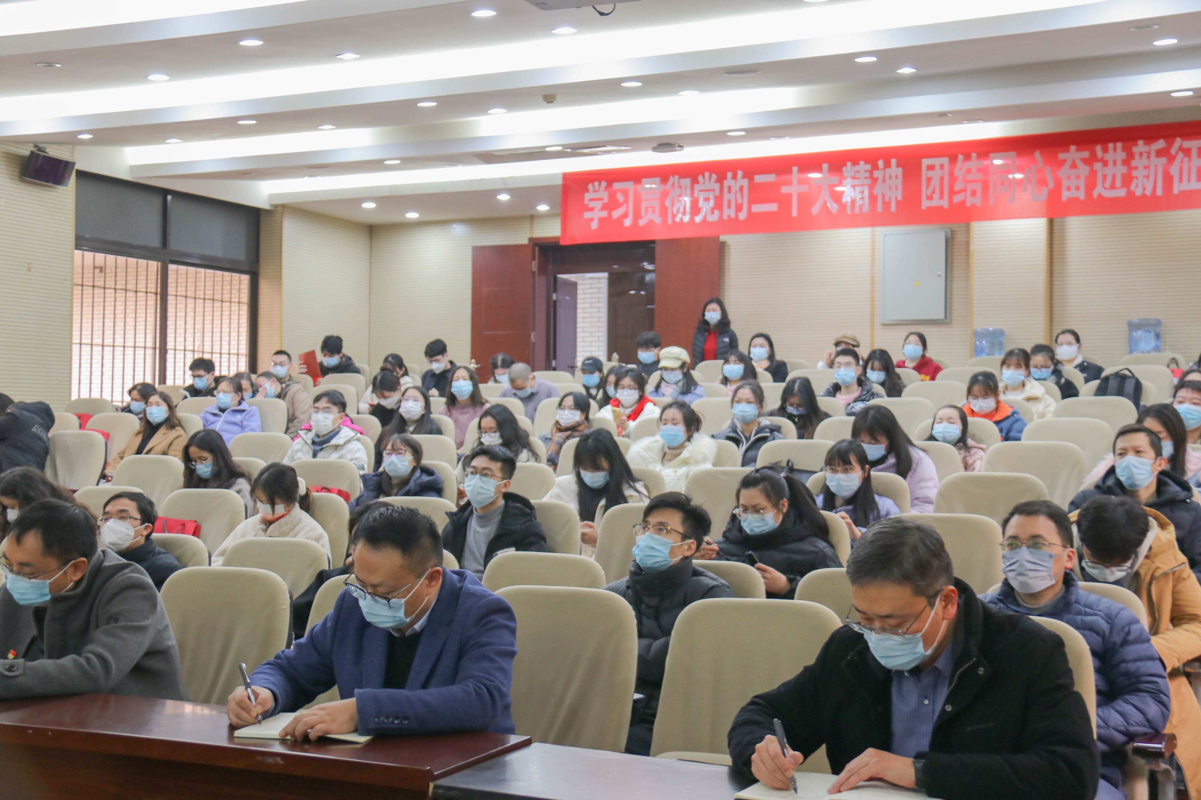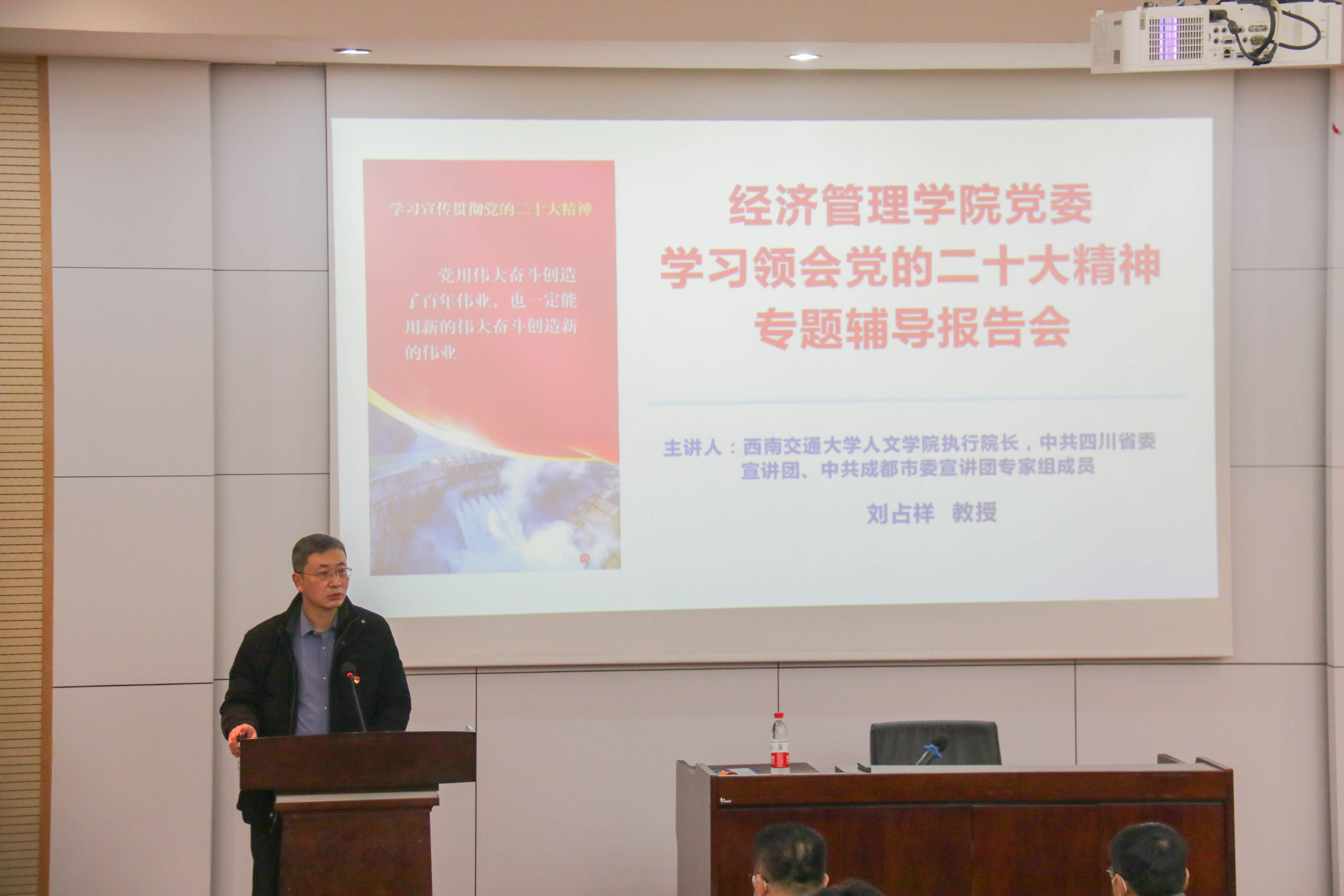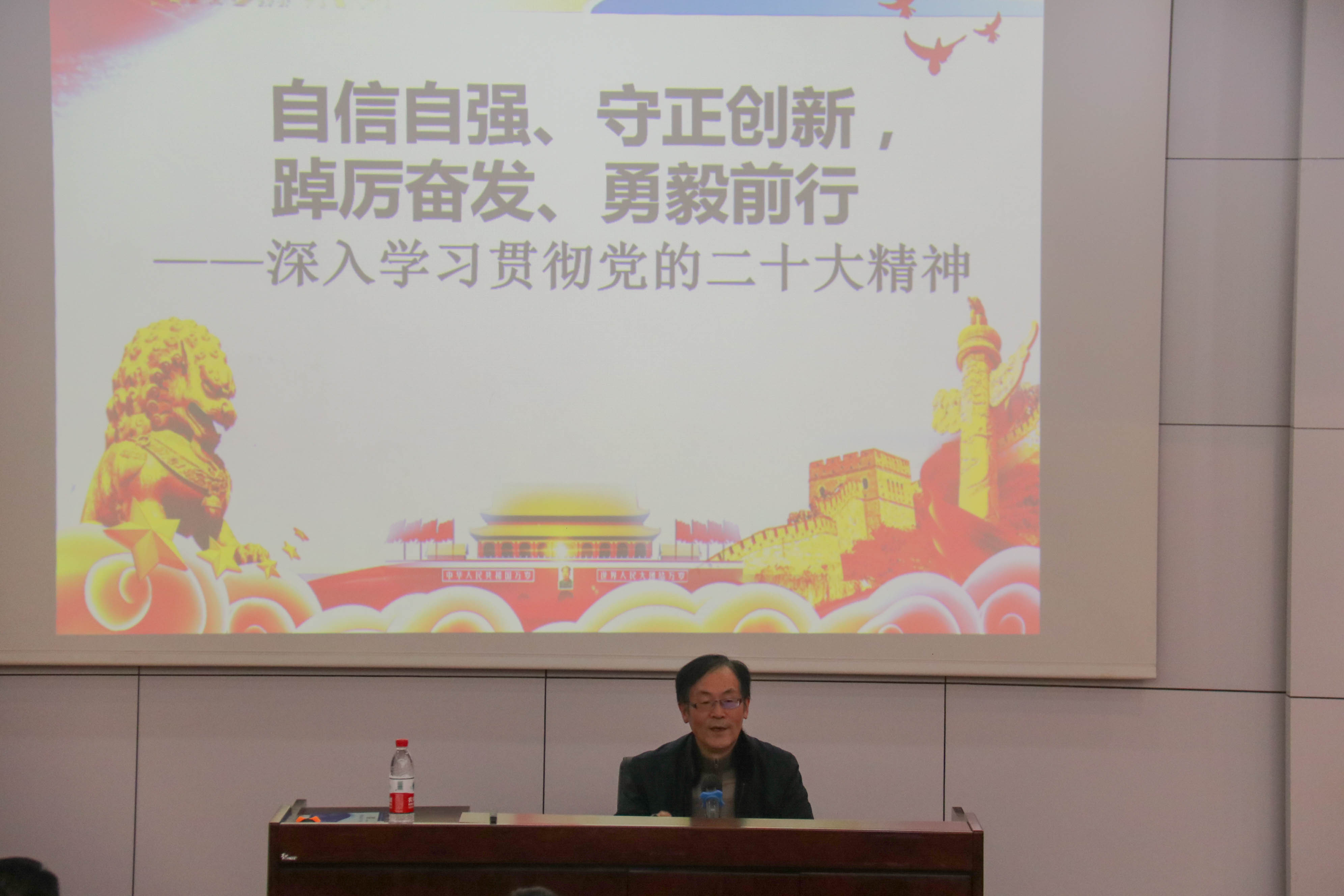 12月8日下午,bat365官网登录入口党委邀请西南交通大学人文学院执行院长,中共四川省委宣讲团、中共成都市委宣讲团、西南交通大学宣讲团专家组成员刘占祥教授作了题为“自信自强、守正创新、踔厉奋发、勇毅前行——深入学习贯彻党的二十大精神”的专题辅导报告,学院党政领导班子、师生各党支部委员、党外知识分子、机关工作人员共100余人参加了报告会。报告会由学院党委书记王斌主持。