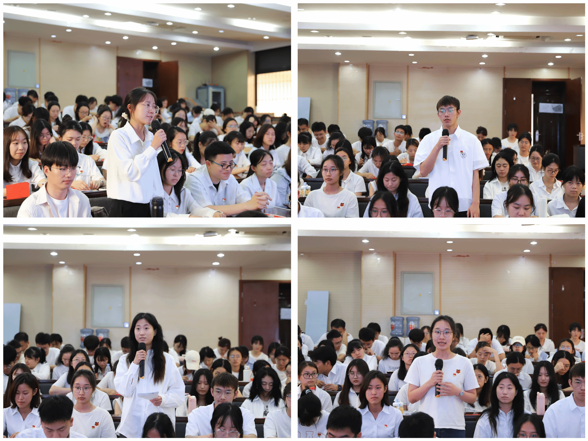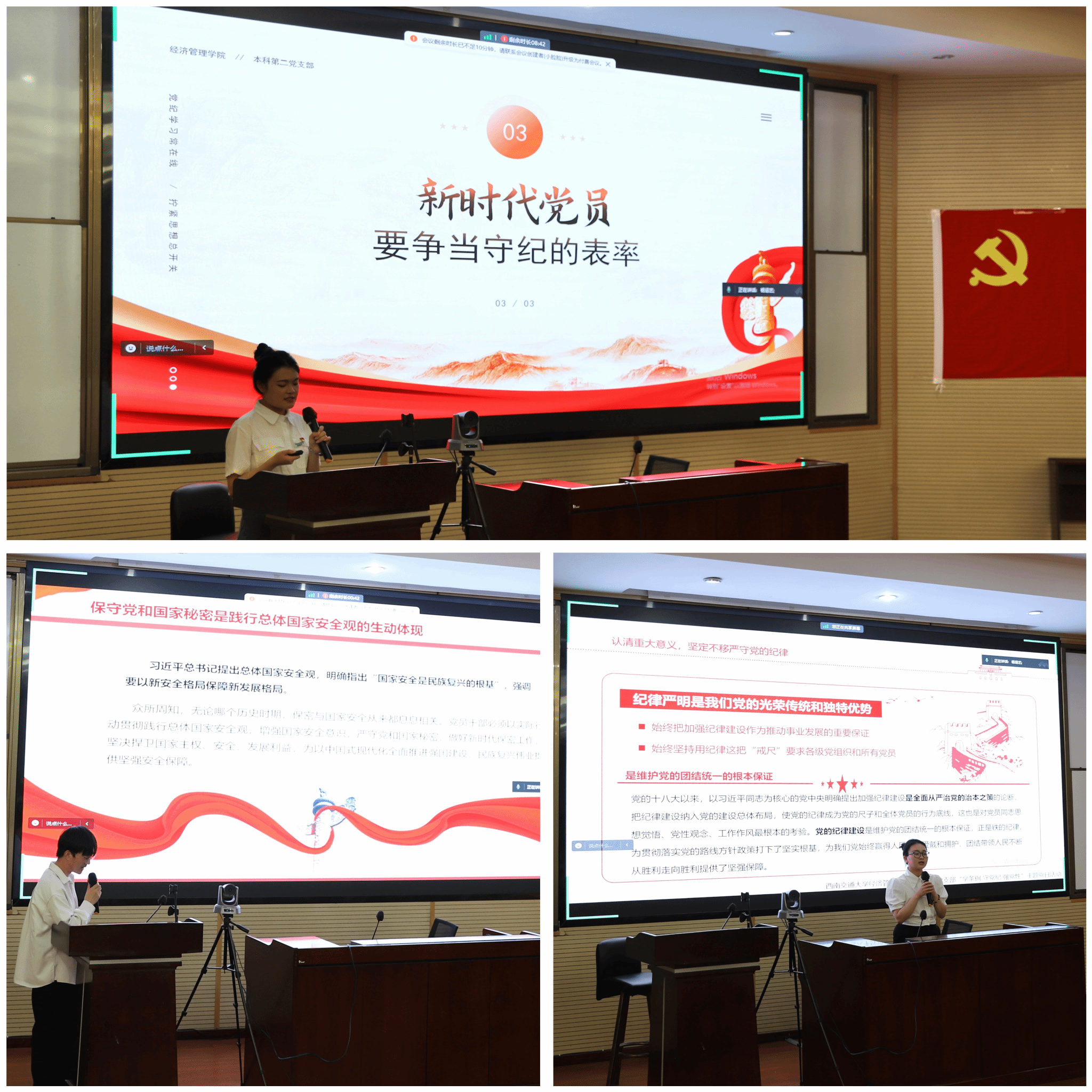 接下来,朱梦、焦新将、李静三位党员同志上台分享他们学习《中国共产党纪律处分条例》的深刻感悟。三位党员同志紧密联系个人成长进步和学习工作实际,解读了与日常工作生活紧密相连的部分条例,结合党员干部违规违纪的具体案例,阐述了作为学生党员更应时刻紧绷纪律这根弦,规范自己的一言一行,管住自己的一点一滴,将纪律规矩内化于心、外化于行,不断提高党性修养和纪律意识。