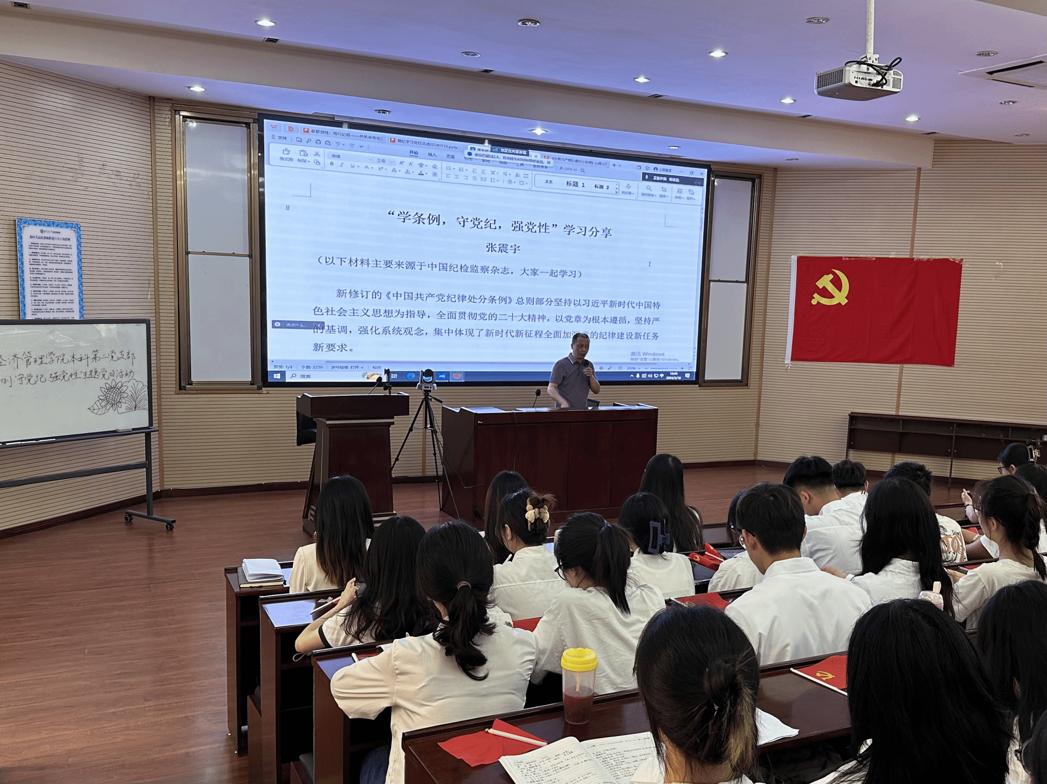 结合张震宇老师、党员同志的分享以及近期的自主学习,现场的党员同志们纷纷主动发言,交流自己的收获与感悟,现场学习气氛浓厚。党员董津康谈到,党纪就如悬挂在头顶的利剑,作为一名即将步入社会的毕业生党员更要将党纪时刻放在心中,遵守党的纪律,加强自我约束,保持自我警醒,无论何时何地从事何种工作,都不能做违法乱纪的事情。党员唐天怡表示,在学习过程中深刻体会到了《中国共产党纪律处分条例》的时代性和针对性,作为一名预备党员不仅仅要学习条例,遵守条例,更要以条例为对照,常怀律己之心,做到言行一致,表里如一,不断提高党性修养和纪律意识,争做一名忠诚、干净、有担当的合格共产党员。