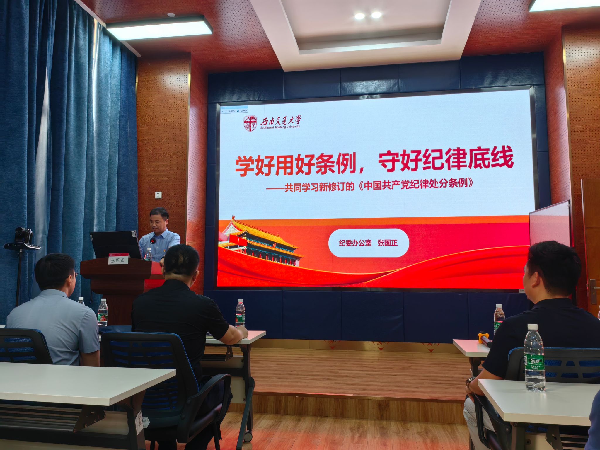 学院党委发挥“头雁效应”,以上率下,示范引领。5月13日,党委理论学习中心组深入学习《中国共产党纪律处分条例》,学院党委书记郭强领学,党委委员原原本本跟学。5月23日,学校纪委张国正副书记为学院作专题导学,结合案例详细解读与师生紧密相关的纪律条款。6月21日,学院党委书记郭强和学院党委副书记、纪委书记晏理斌面向2024届毕业生开展党纪廉洁教育,强调诚信廉洁的重要性。6月26日,学院党委书记郭强讲授专题党课,结合案例阐释新旧《条例》变化,强调师生应遵守党纪,为党的事业和社会发展贡献力量。