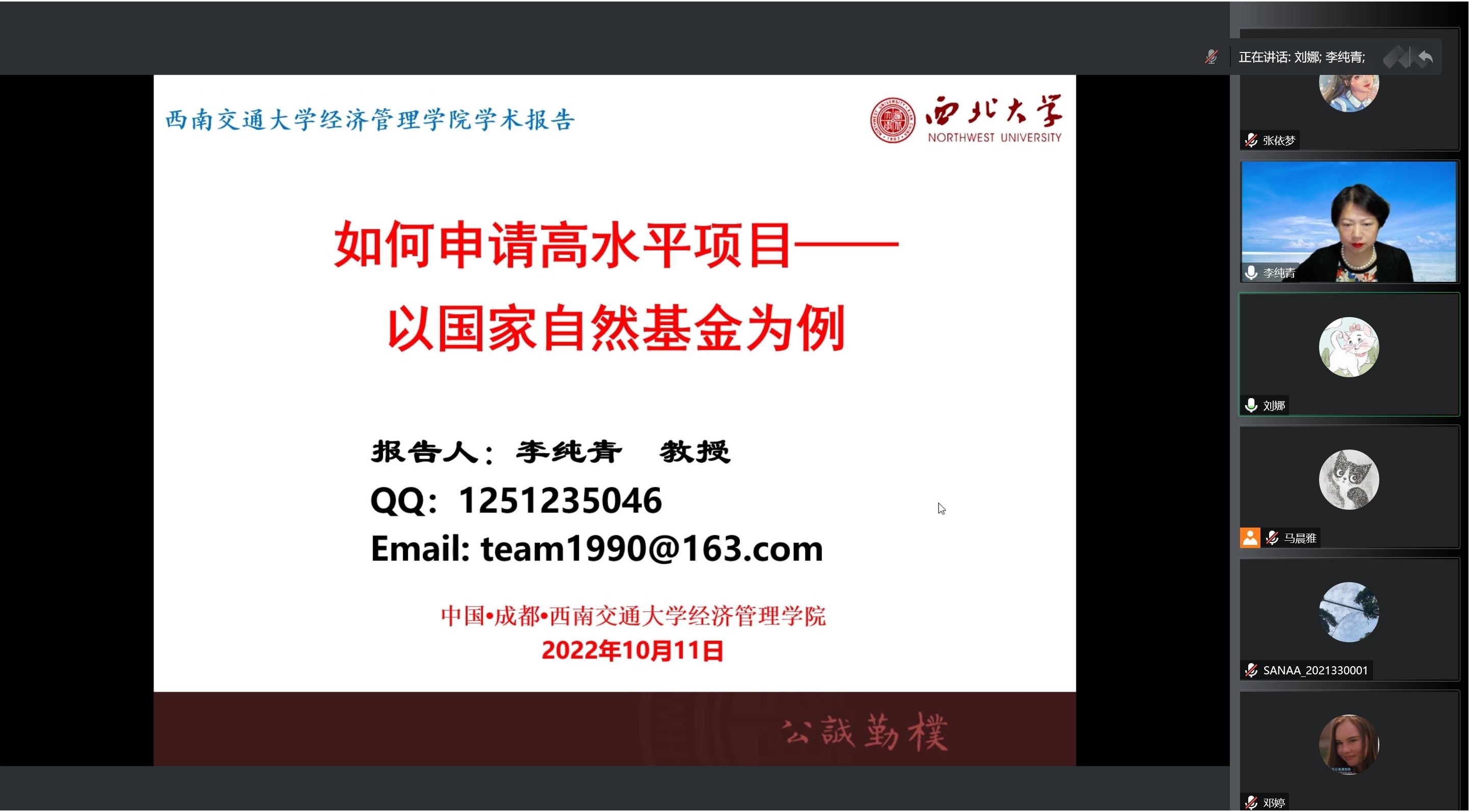 2022年10月11日上午9:30,西北大学管理学院李纯青教授应邀以“如何申请高水平项目——以国家自然科学基金为例”为题为我院师生进行线上学术报告。本次学术活动由学院市场学系刘娜老师主持,校内外师生60余人参加了本次讲座。