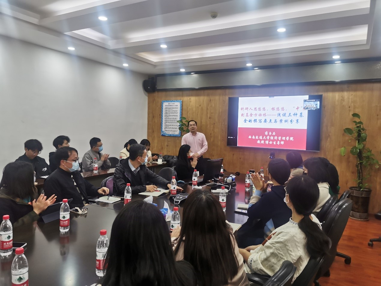 2022年11月24日下午3点,学院在九里校区信息楼0607召开2023年基金申报交流会(第二场)。受疫情影响,此次会议采取线上线下相结合的方式,全院40余位教师和博士生参加会议。会议由bat365官网登录入口党委书记王斌主持,我院市场学系蒋玉石教授分享了申报教育部人文社科基金、国家社会科学基金和国家自然科学基金项目的经验。