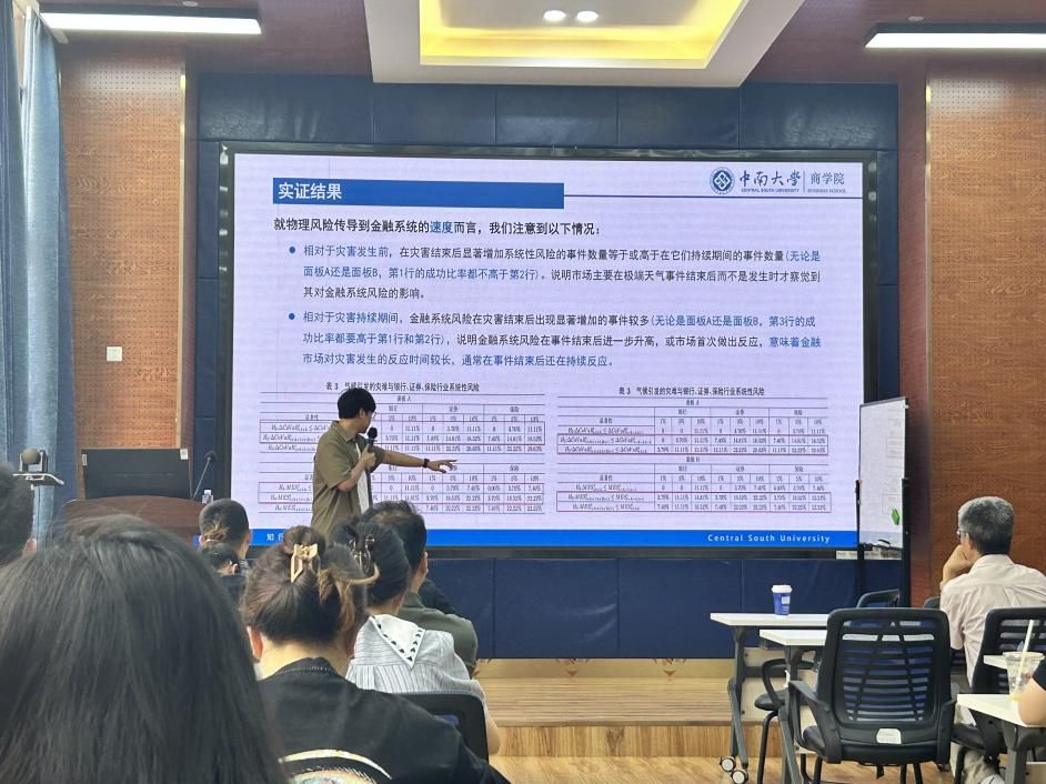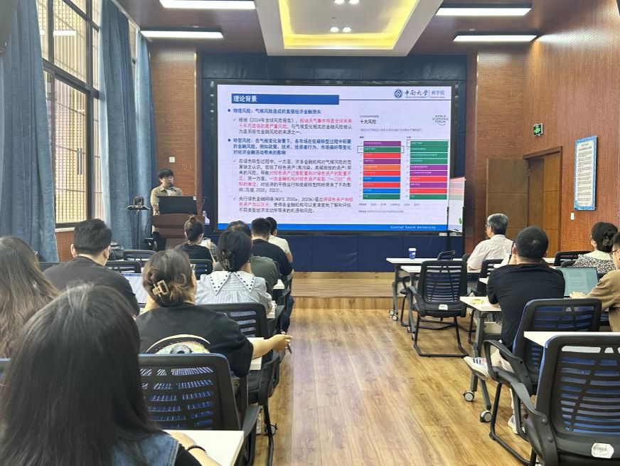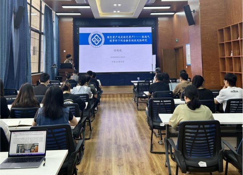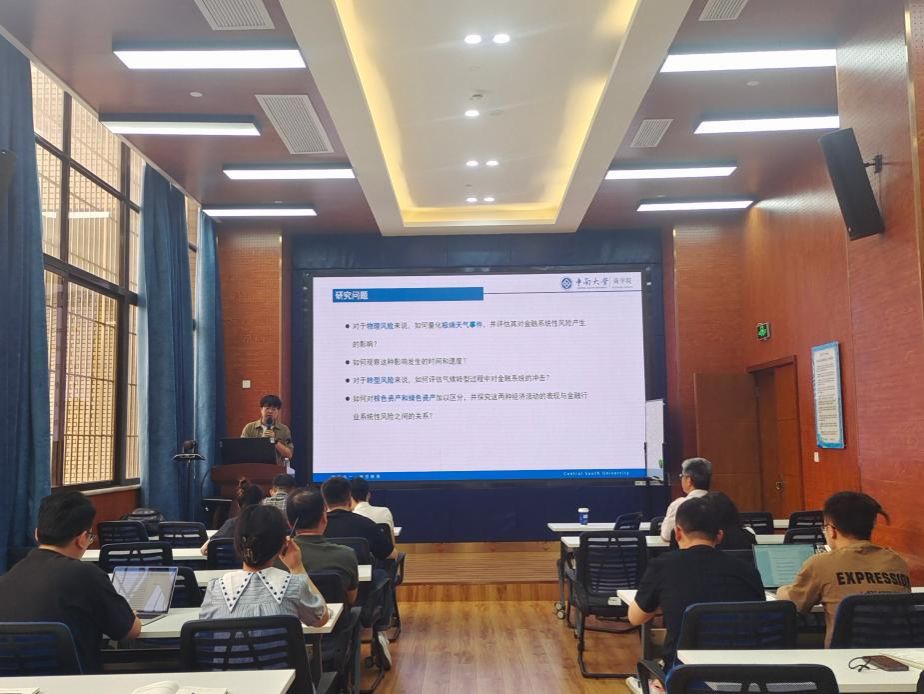 2024年5月14日,中南大学商学院任晓航副教授应邀在学院为我院师生作题为“绿色资产还是棕色资产?——极端气候事件下的金融系统性风险研究”的学术讲座。此次学术活动由学院马锋副教授主持,学院部分教师及研究生参加此次讲座。马锋副教授对任晓航副教授的学术成果进行了介绍,并对他的到来表示热烈的欢迎与感谢。