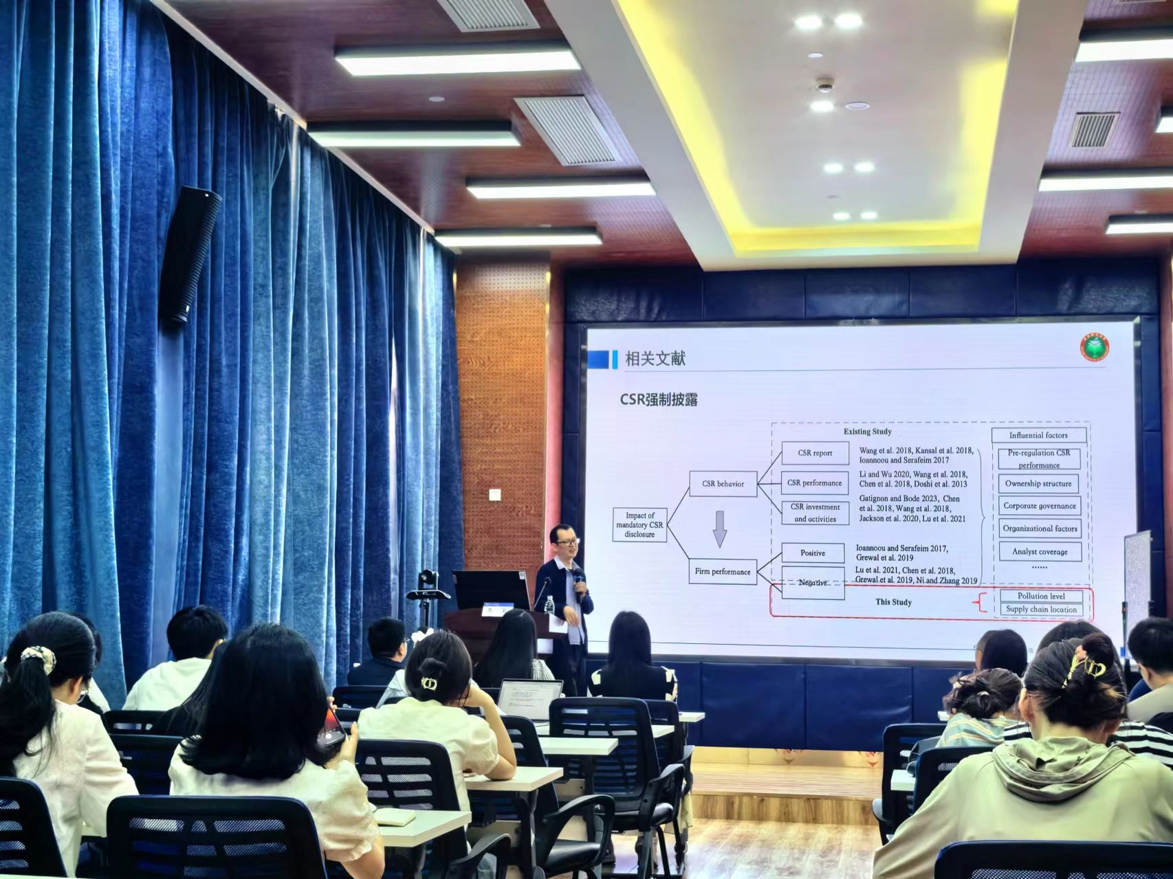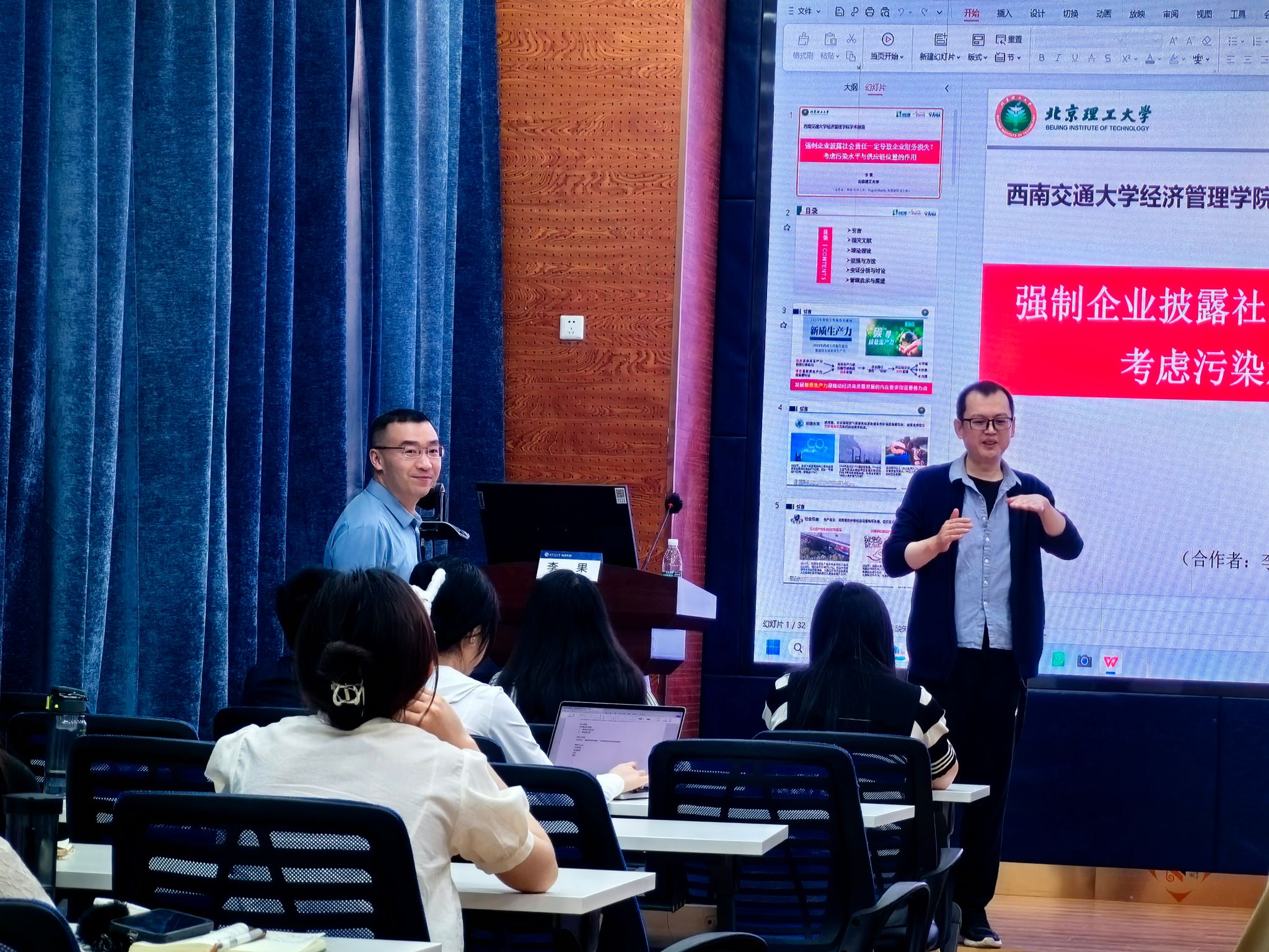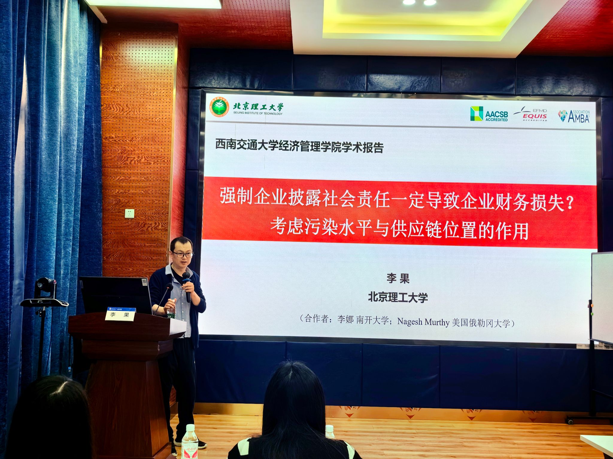 2024年5月24日,北京理工大学管理与经济学院管理科学与物流系主任,国家高层次人才计划入选者李果教授应学院邀请,来我院展开学术交流活动,交流主题为“强制企业披露社会责任一定导致企业财务损失?考虑污染水平与供应链位置的作用”。本次学术活动由学院副院长聂佳佳教授主持,学院部分教师、博士生和硕士生等50多人参加了此次学术活动。聂佳佳教授首先对李果教授的学术成果进行了介绍,同时对李果教授的来访表示热烈的欢迎!