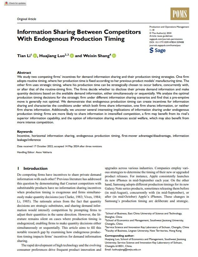 bat365官网登录入口罗华江老师于2024年6月在UTD 24期刊Production and Operations Management在线公开发表题为《Information Sharing Between Competitors With Endogenous Production Timing》的论文。