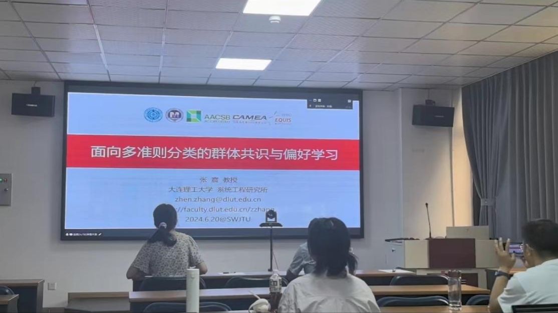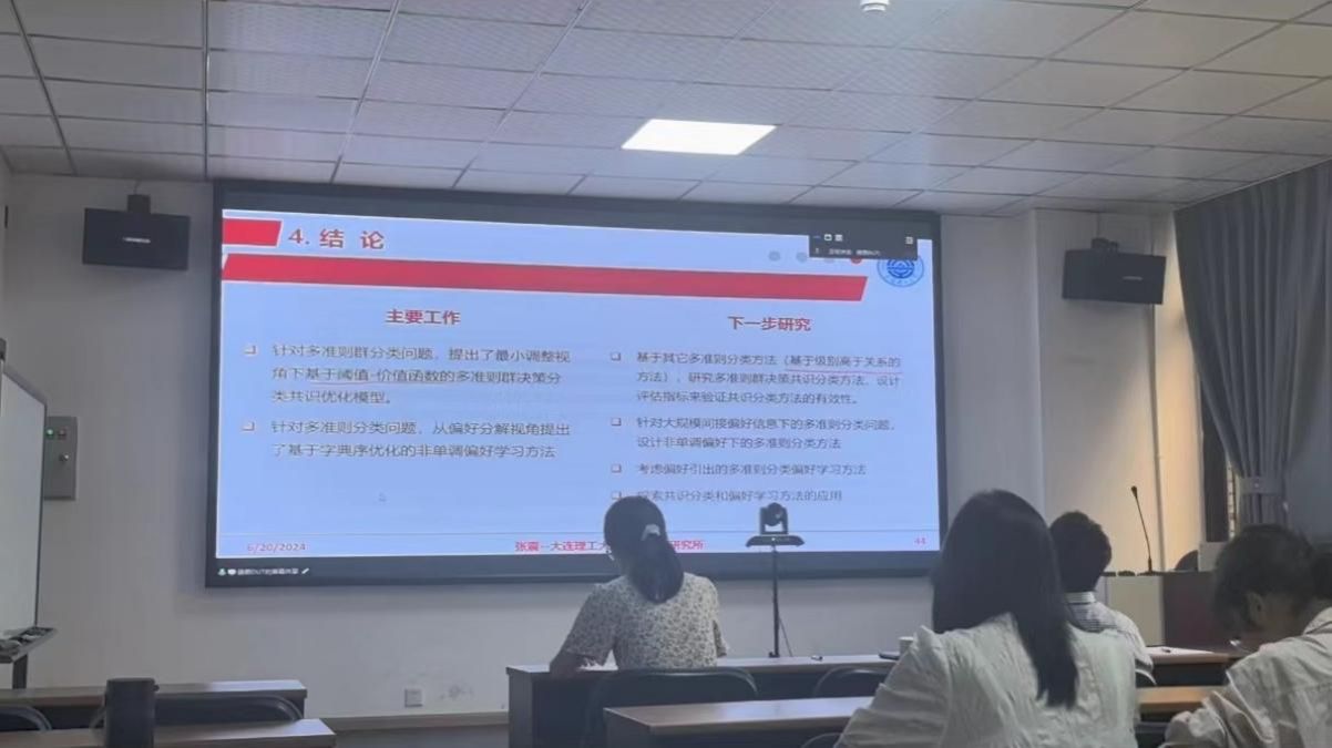 张震教授进行了题为“面向多准则分类的群体共识与偏好学习”的分享。张教授首先分析了多准则分类问题涉及的群体共识和偏好学习问题,然后详细汇报了基于最小调整的多准则群决策共识分类模型和基于字典序优化的多准则分类非单调偏好学习方法。最后,他对该领域未来的研究方向进行了展望,为与会师生提供了宝贵的研究思路。