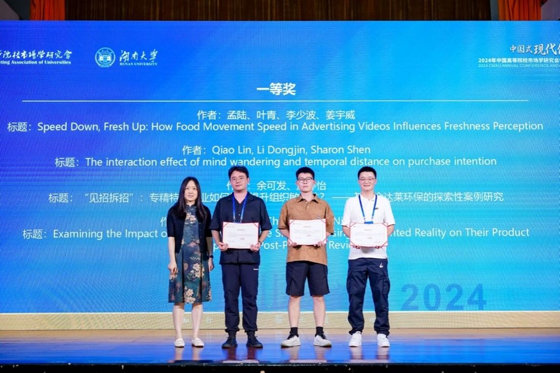 孟陆特聘副研究员的论文《Speed Down, Fresh Up: How Food Movement Speed in Advertising Videos Influences Freshness Perception》荣获会议论文一等奖,该论文深入探讨了广告视频中食物运动速度对消费者新鲜度感知的影响,为广告心理学及市场营销领域的研究提供了新视角。