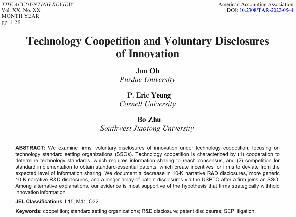bat365官网登录入口会计学系副教授诸波于2024年8月在UTD 24期刊The Accounting Review在线公开发表题为Technology Coopetition and Voluntary Disclosures of Innovation的论文。该论文以技术标准制定机构(SSO)为研究对象,考察了企业在技术竞合下创新的资源披露情况。技术竞合的特点是:(1)合作制定技术标准,这要求企业信息共享以达成共识;(2)竞争标准执行以获得标准必要专利,这会激励企业偏离预期的信息共享水平。研究发现,在企业加入SSO后,减少了10-K文件中的叙事性研发披露、10-K文件中披露更通用的叙事性研发信息,更长地延迟通过美国专利商标局进行专利披露。论文的实证证据支持企业策略性地隐瞒创新信息披露的假设。