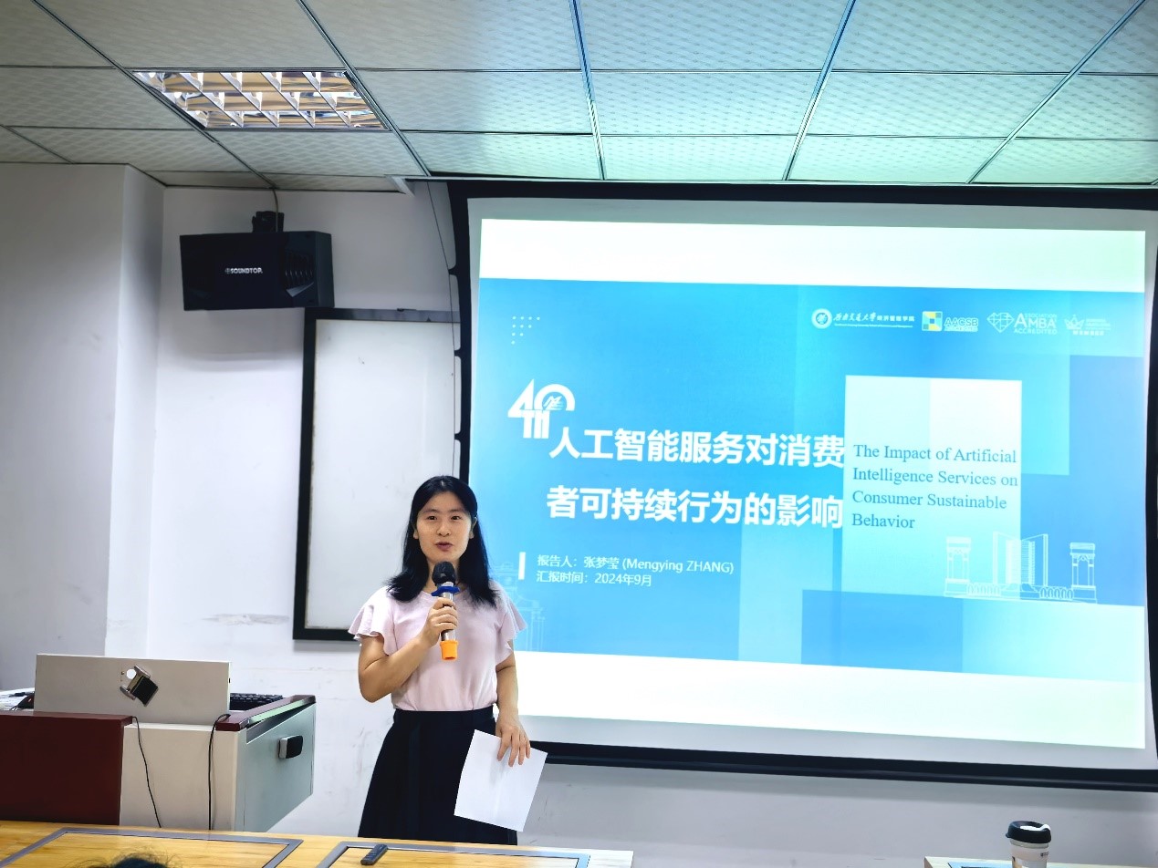 2024年9月27日上午10点,西南交通大学九里校区零号楼0302室举办了新青年教师系列讲座。本次讲座邀请了bat365官网登录入口市场学系的助理教授张梦莹博士,围绕“人工智能服务对消费者可持续行为的影响”这一主题展开,学院部分师生到场聆听,讲座由市场学系副系主任范春梅副教授主持。
