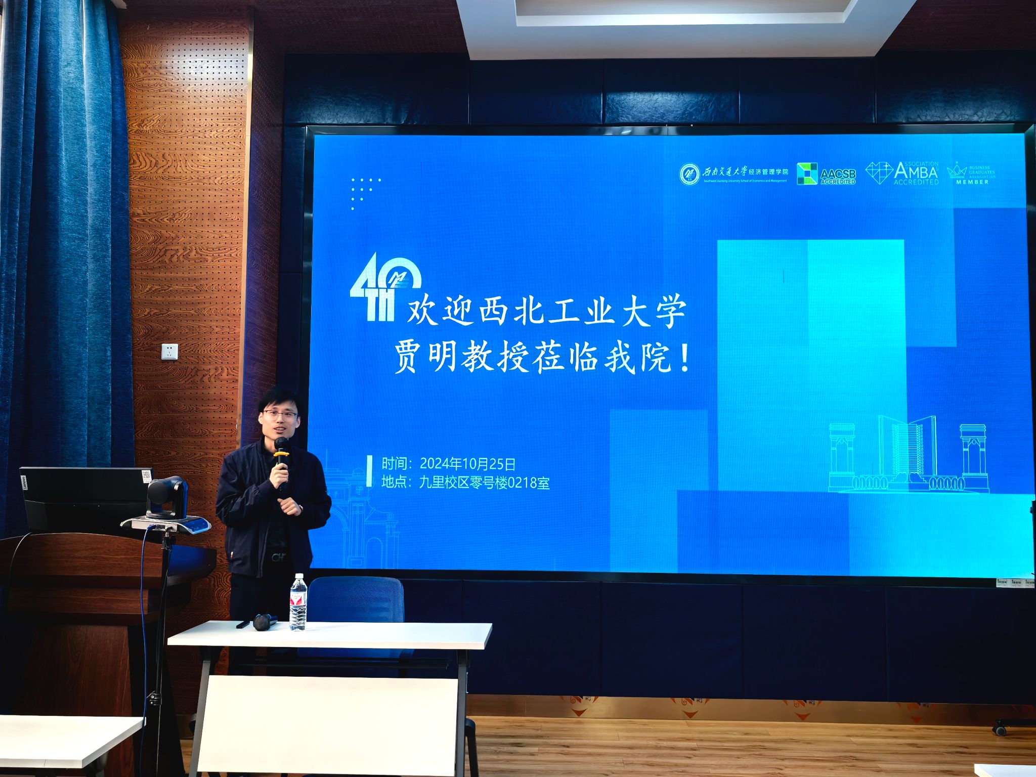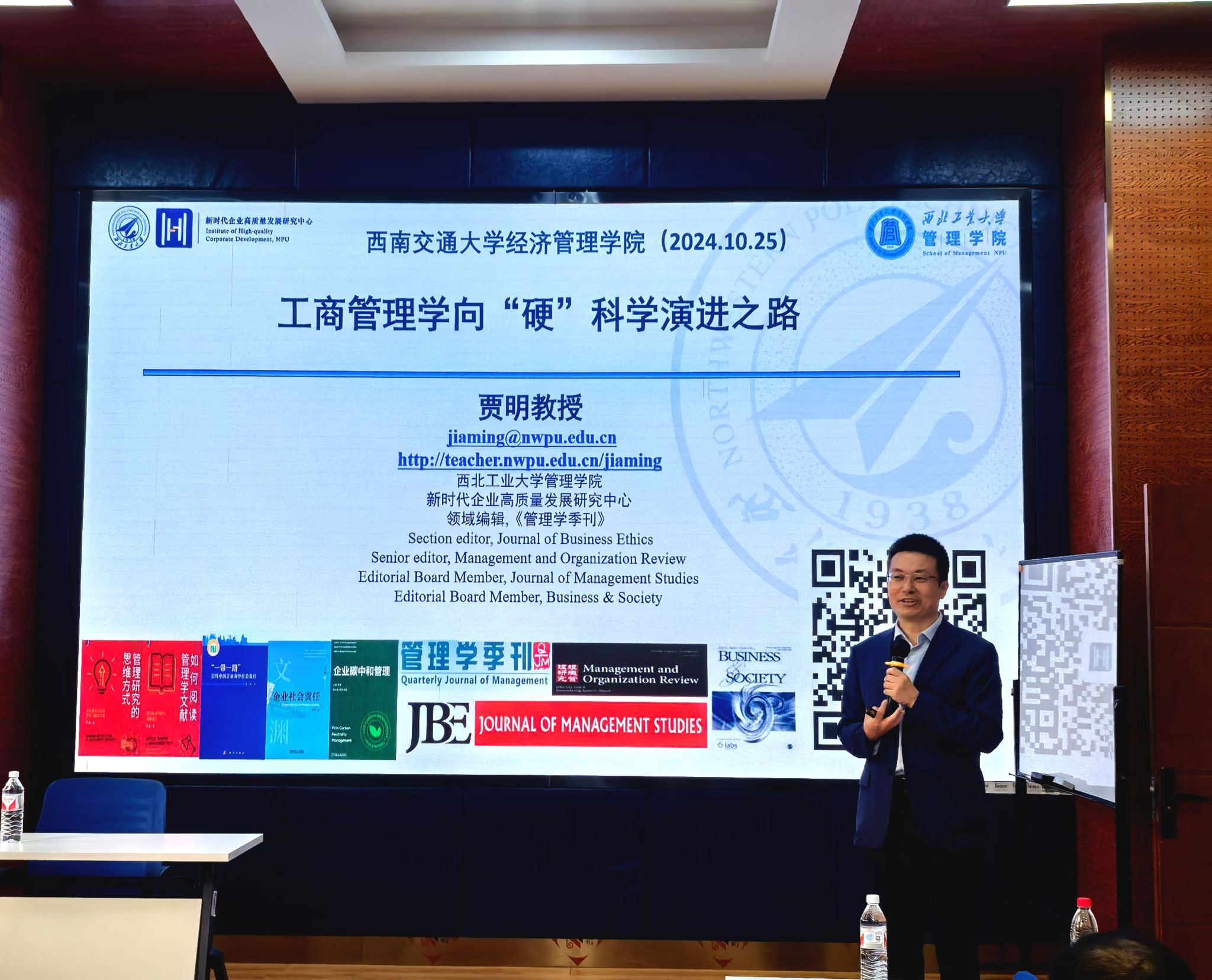 2024年10月25日下午,西北工业大学管理学院贾明教授应邀在九里校区bat365官网登录入口为我院师生带来了一场聚焦于“工商管理向硬科学演进之路”的学术讲座。本次学术活动由副院长马锋主持,学院部分教师及研究生60余人参加此次活动,副院长马锋介绍贾明教授的学术背景与成就,并代表学院对贾明教授表示欢迎与诚挚的感谢。