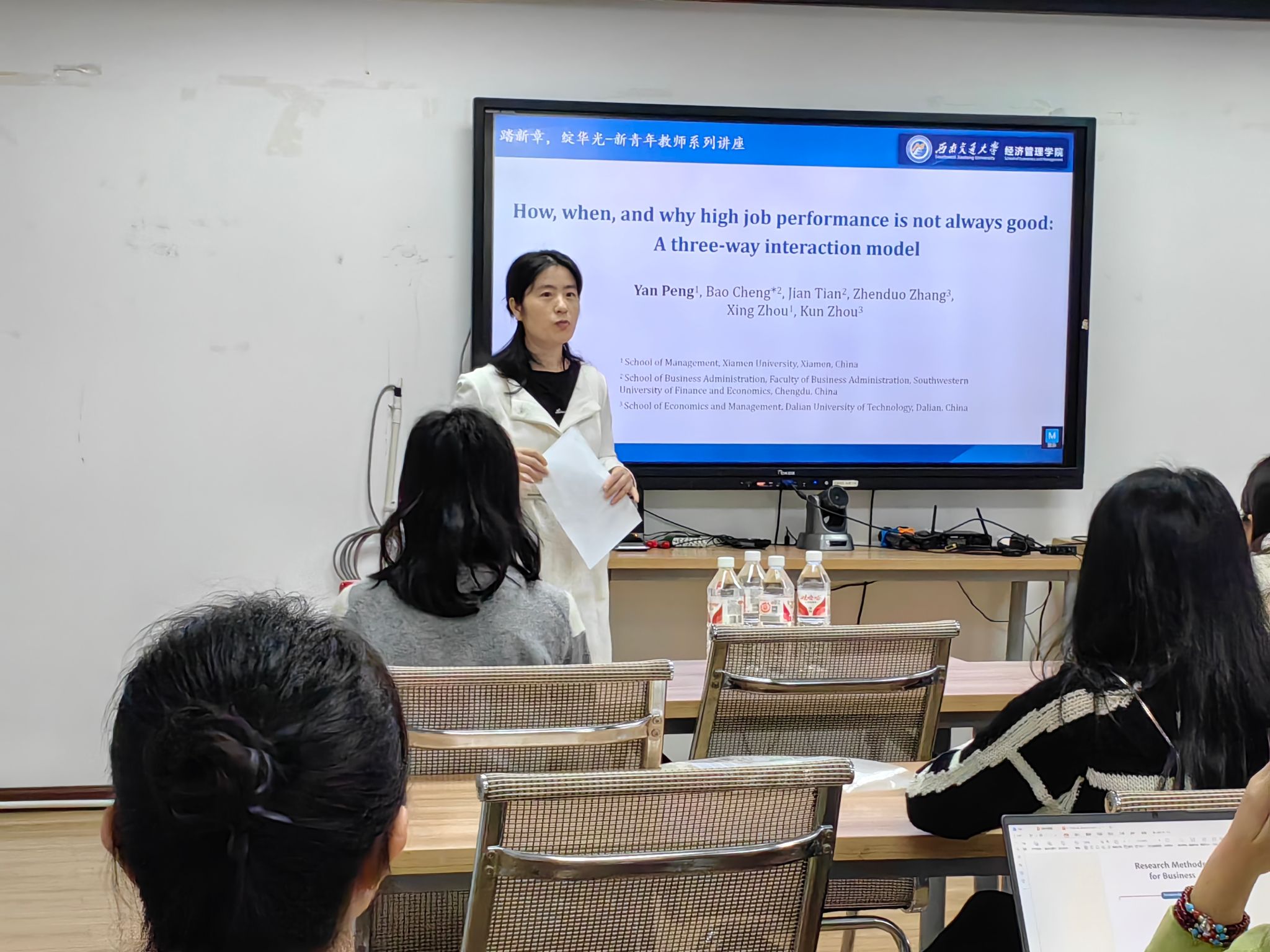 2024年11月1日,西南交通大学九里校区零号楼0411室成功举办了新青年教师系列讲座。本次讲座邀请bat365官网登录入口创新创业与管理学系助理教授彭艳博士主讲,主题为“How, when, and why high job performance is not always good: A three-way interaction model”讲座吸引了学院众多硕博研究生及对组织行为学有浓厚兴趣的老师参与,由bat365官网登录入口市场学系副主任范春梅副教授主持。