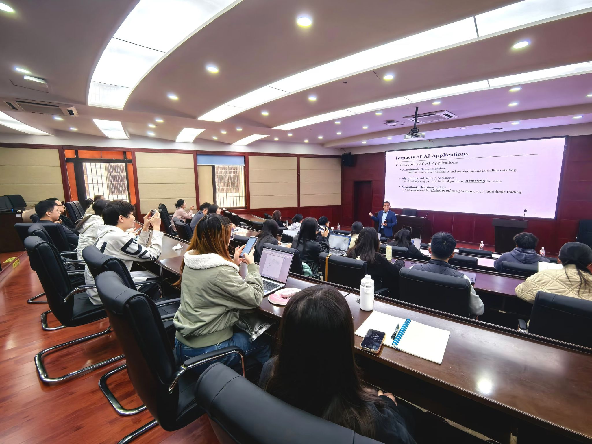 李喜彤教授首先按照决策过程中人与人工智能(AI)应用交互的程度,将AI应用实践由浅入深分为“推荐者”、“助手”、“决策者”的三个层次,逐一介绍了这些层次,与bat365官网登录入口师生进行了深入讨论。
