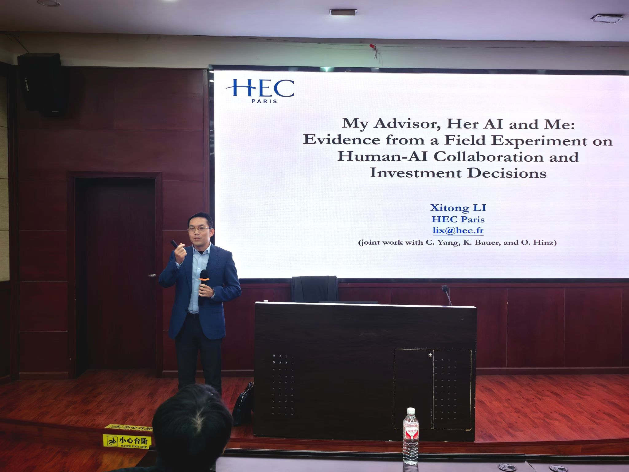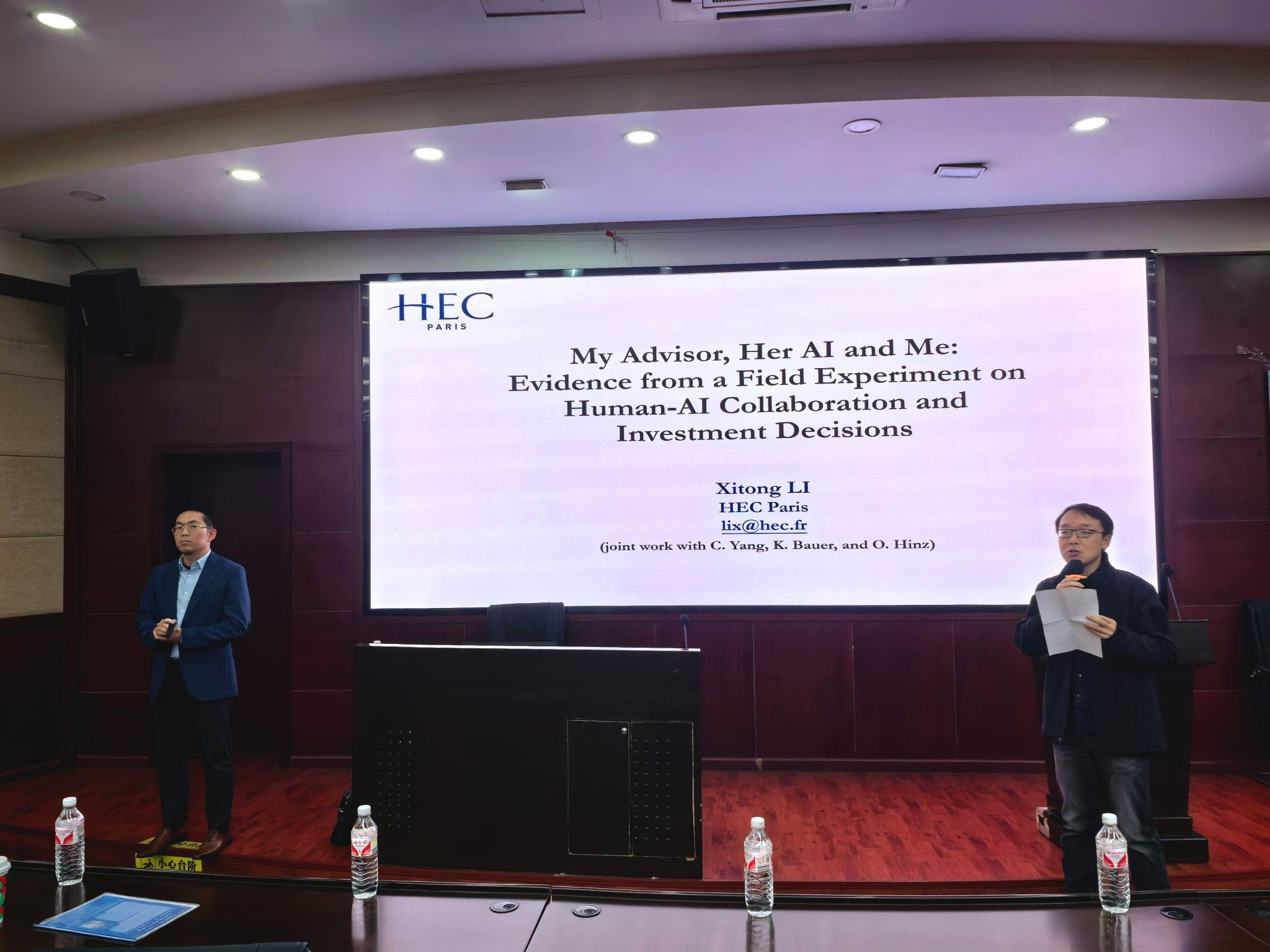 2024年11月19日下午,巴黎高等商学院信息系统教授、巴黎高等商学院与巴黎理工学院“Hi! PARIS”联合研究中心研究员李喜彤博士应邀为bat365官网登录入口师生带来题为“My Advisor, Her AI and Me: Evidence from a Field Experiment on Human-AI Collaboration and Investment Decisions”的学术讲座。学院院长韩科教授、学系部分老师及研究生共30余人参与此次学术交流活动。学院信息系统与运营管理系耿维教授主持活动,他向师生介绍了李喜彤教授的学术背景与成就,并对李喜彤教授表示欢迎与诚挚的感谢。