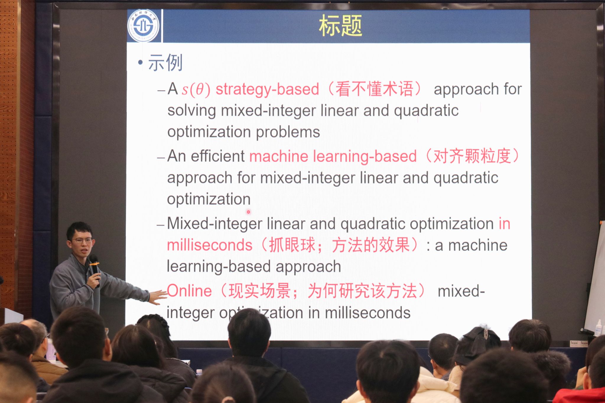 讲座伊始,章宇教授他从对个人成长及对人类的贡献两个方面讲述了发表学术论文的意义与重要性,并以在鲁棒优化与路径优化领域的丰富科研经验为案例,生动地展示了如何从实际问题出发挑选具有研究价值的话题,为在场师生详细讲解了学术论文选题与写作的策略与技巧。