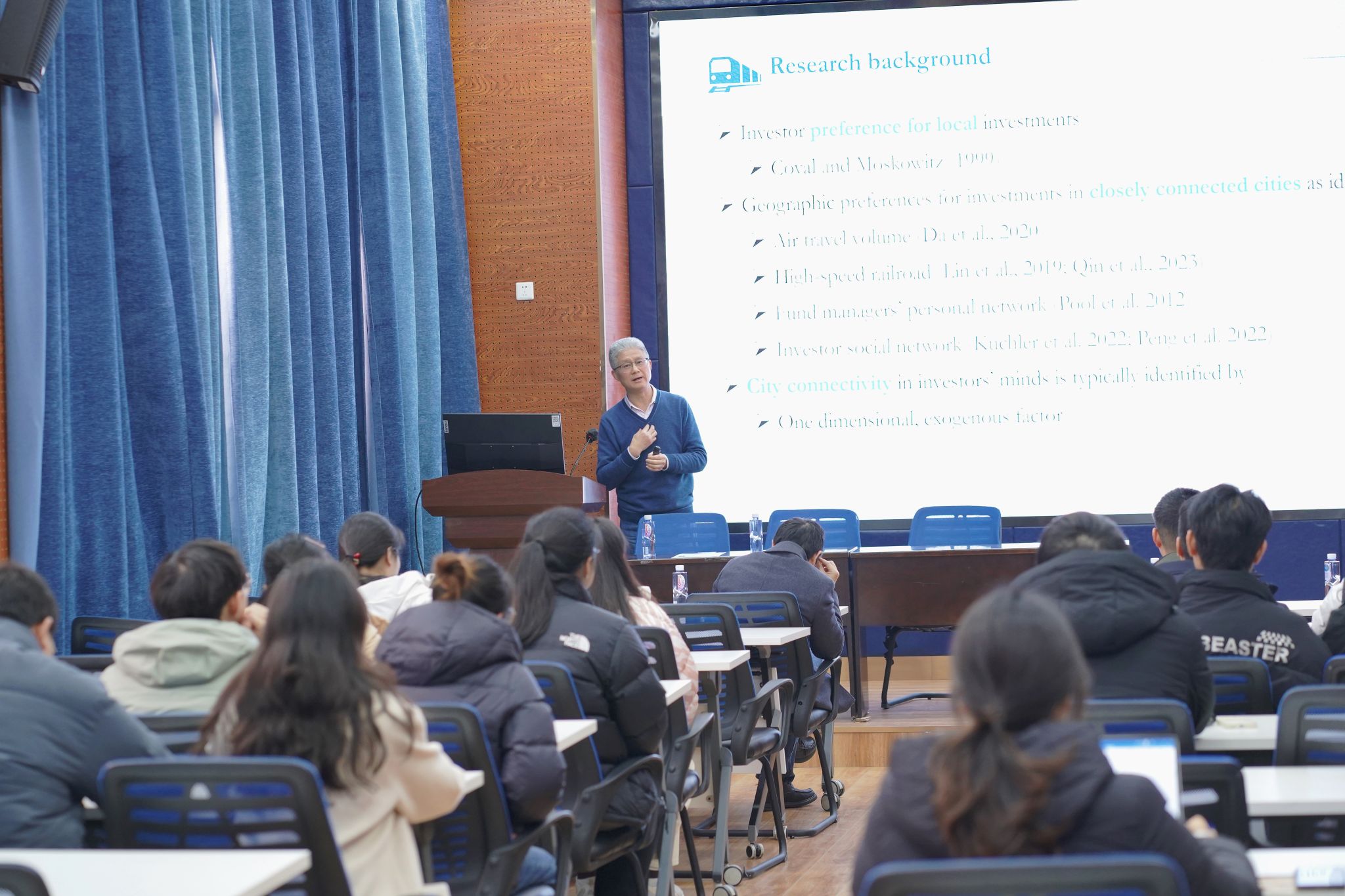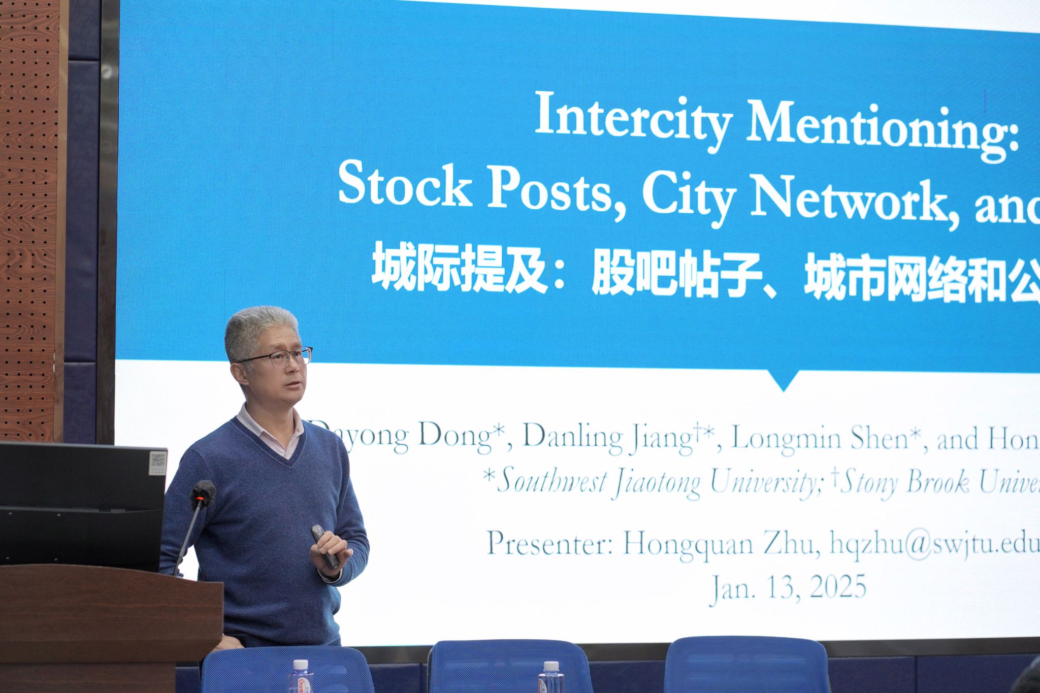 2025年1月13日,在西南交通大学九里校区bat365官网登录入口举办了师道永传,匠心筑梦——资深教师系列讲座,本次讲座特邀学院的朱宏泉教授作为主讲嘉宾,围绕“Intercity Mentioning: Stock Posts, City Network, and Firms(城际提及:股市帖子、城市网络与企业)”这一主题展开。本次学术活动由金融与财务学系主任董大勇教授主持,董大勇教授向与会者介绍了朱宏泉教授的学术背景及其在该领域的贡献,并对朱教授的分享表达了诚挚地感谢。