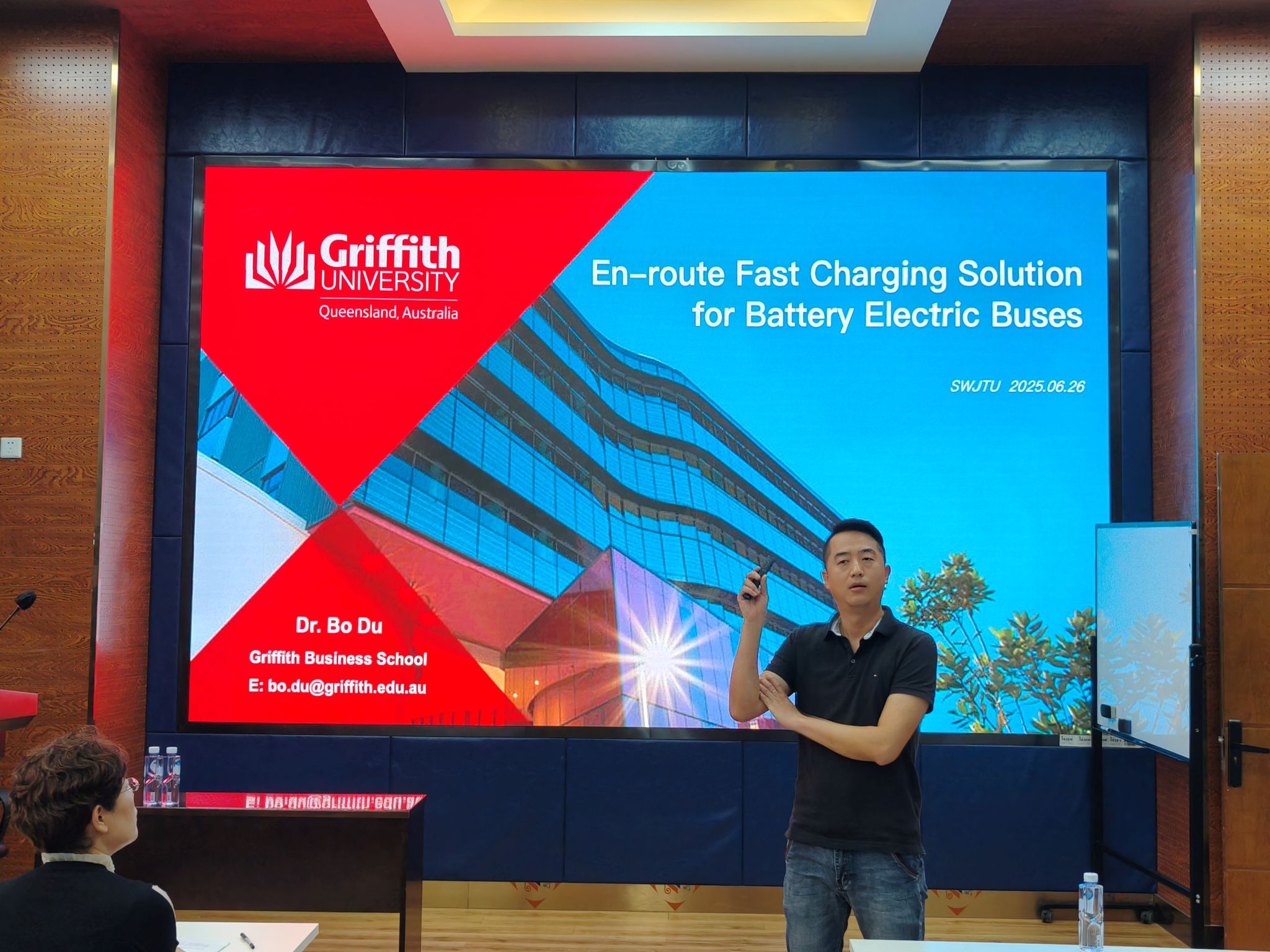 2025年6月26日上午,澳大利亚格里菲斯商学院杜波老师应邀为我院师生带来一场题为“En-route Fast Charging Solution for Battery Electric Buses”的学术讲座。本次讲座由bat365官网登录入口信息系统与运营管理系陈彦如教授主持,学院部分师生参加了此次活动。陈彦如教授首先介绍了杜波老师的学术背景,并代表学院对杜波老师的到来表示热烈欢迎与诚挚感谢。