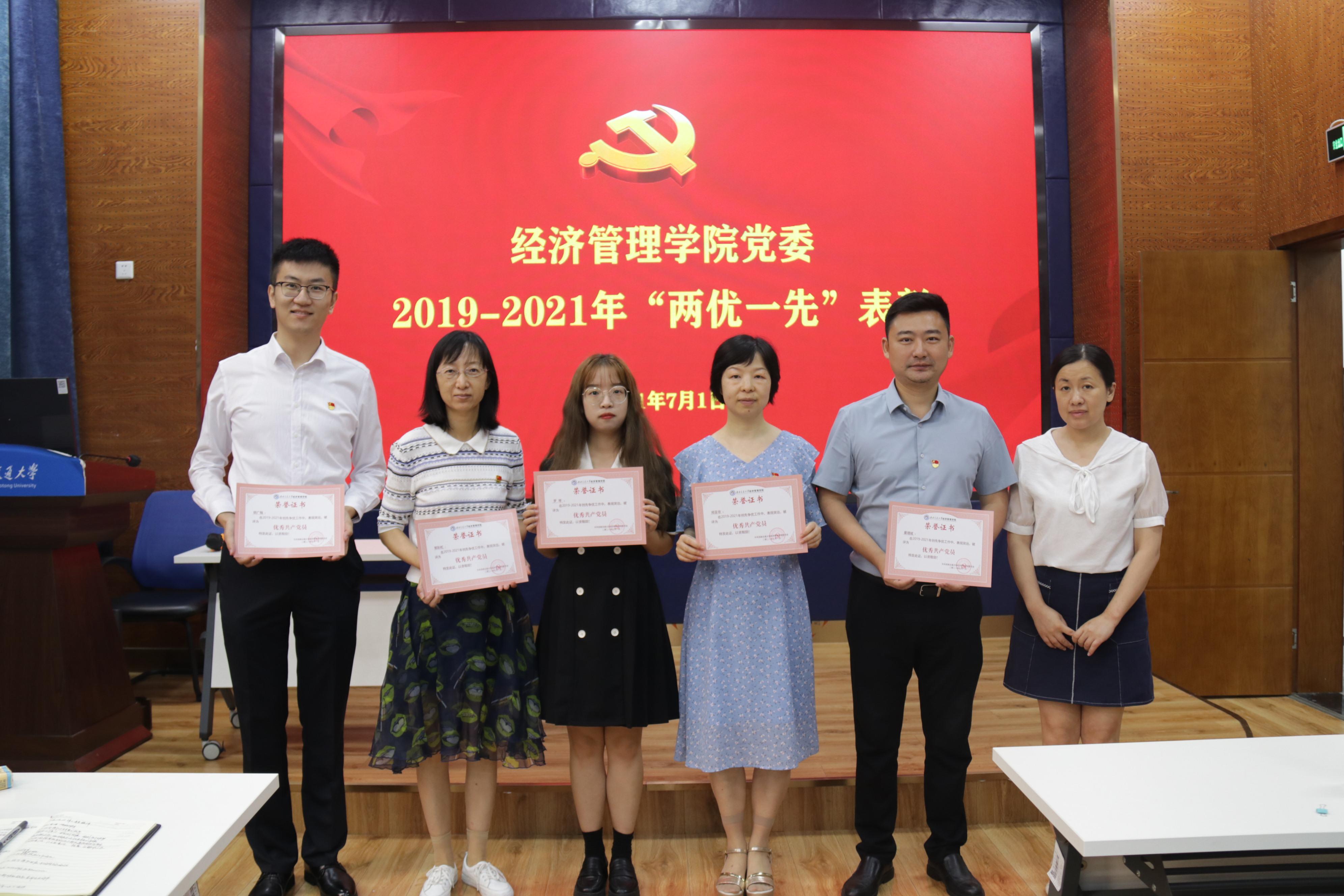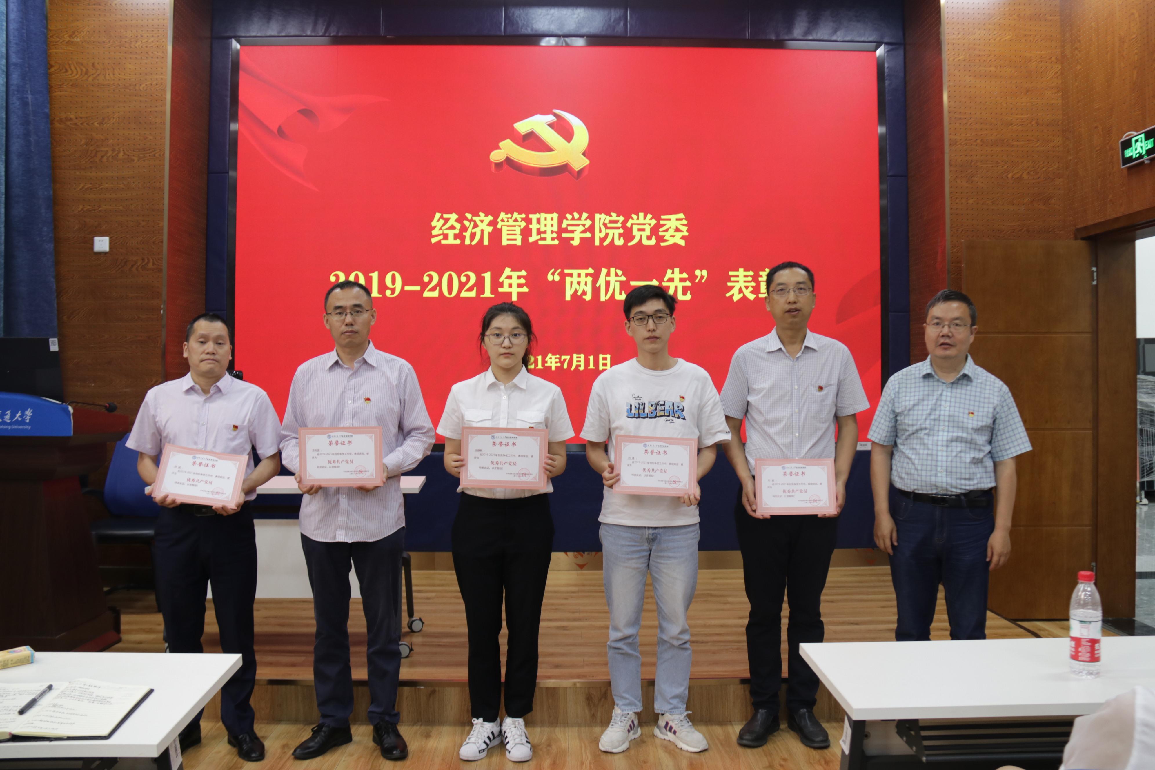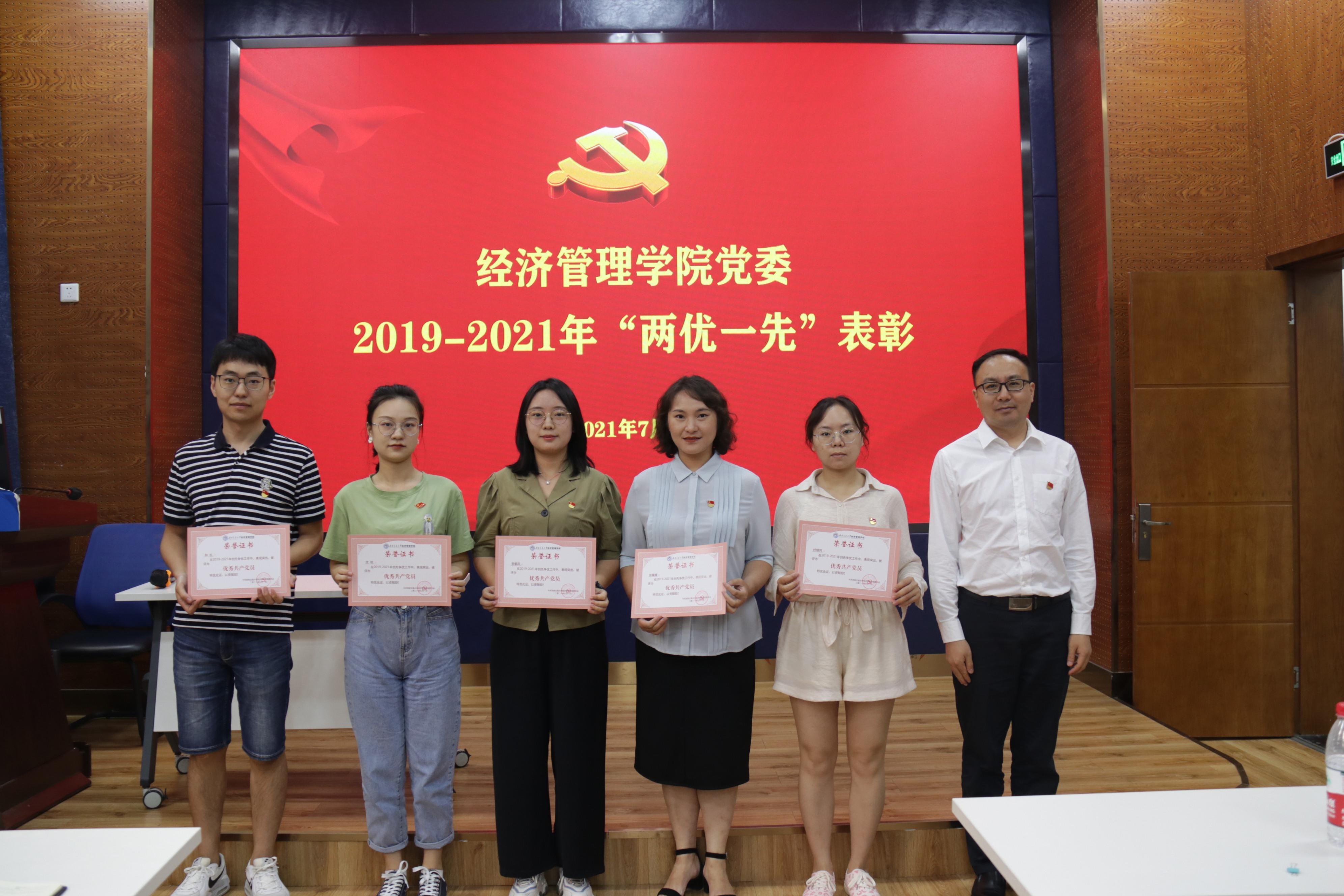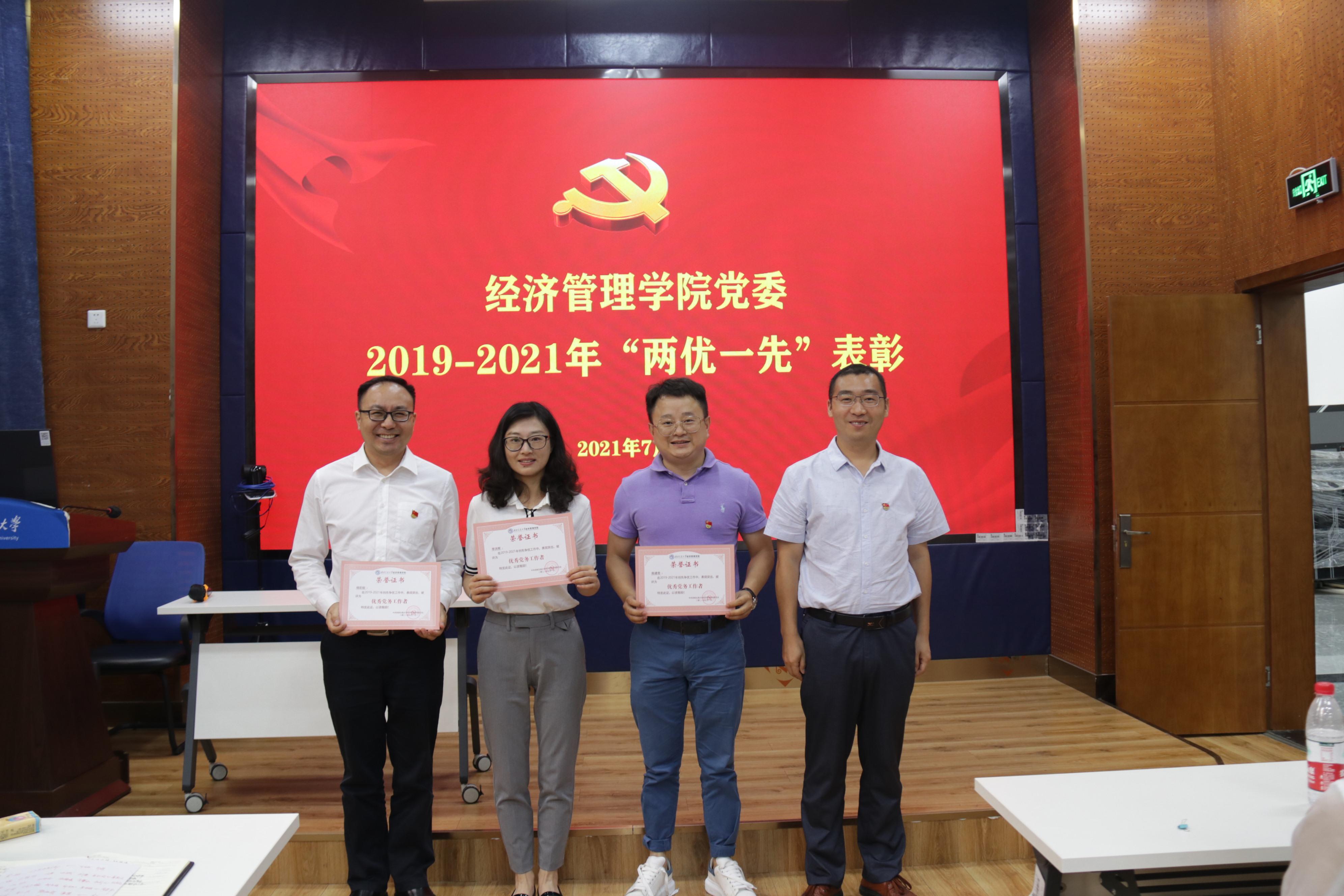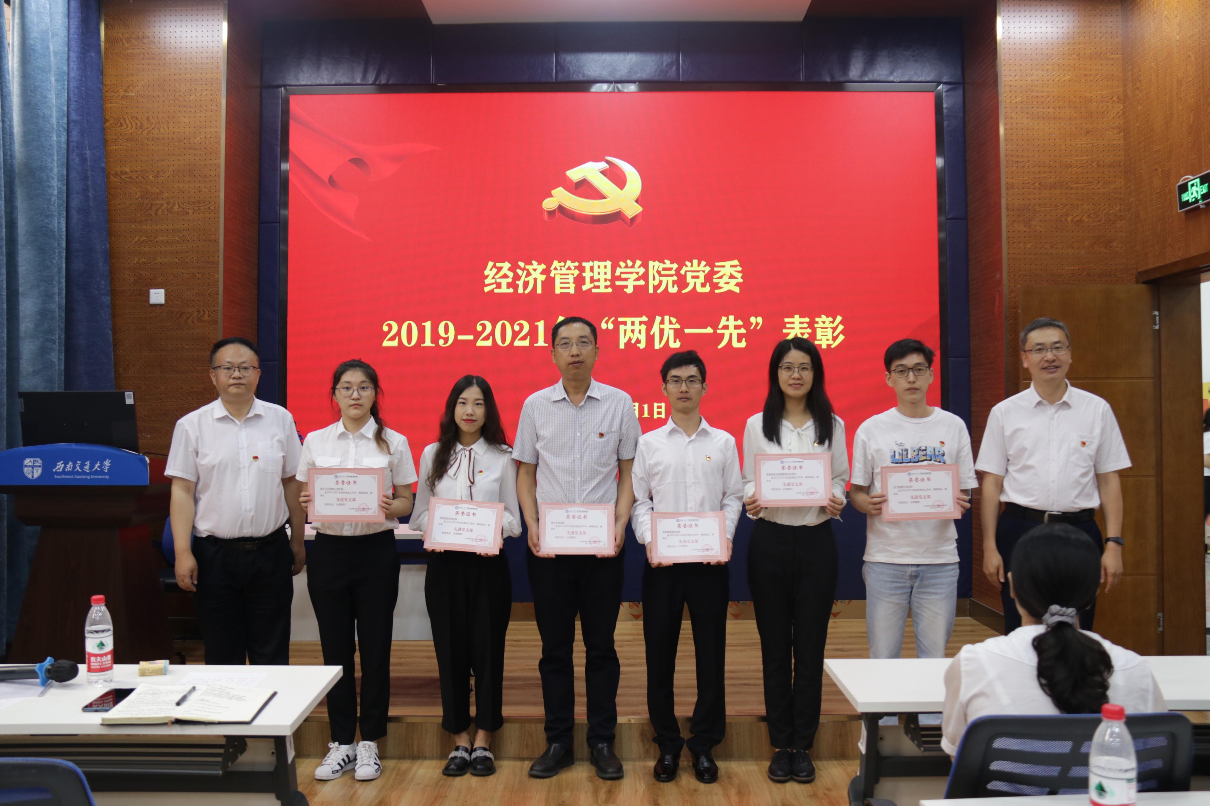 观看庆祝中国共产党成立100周年大会后,学院党委进行了2019-2021年“两优一先”表彰,学院党委书记王斌主持了表彰会,执行院长郭强宣读了表彰名单,学院领导班子成员王斌、郭强、夏显波、杨宏毅、周嘉南、李良、聂佳佳分别向先进党支部、优秀党员、优秀党务工作者颁发了奖状