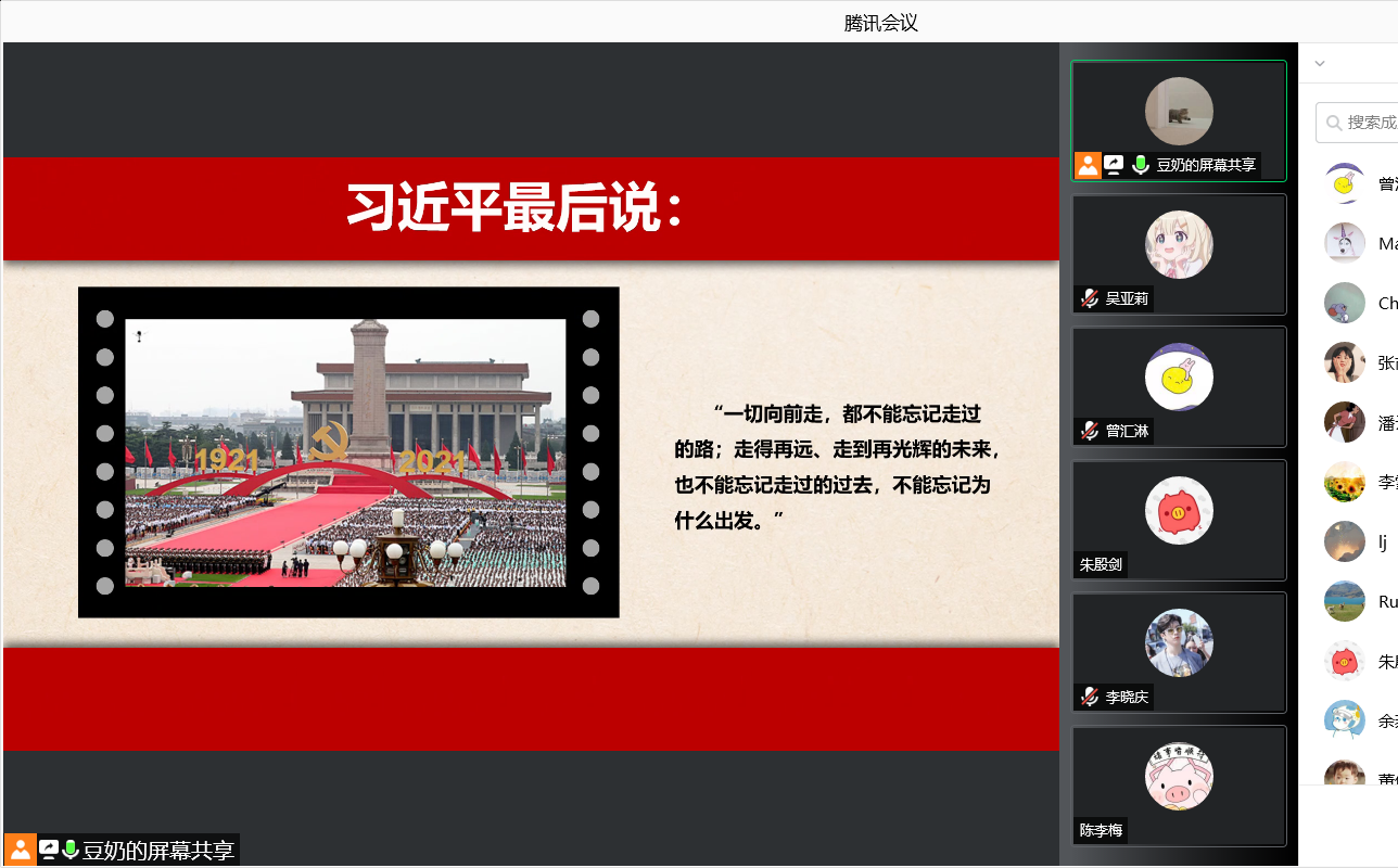 会议之初,曲芯雨同志带领大家学习了习近平总书记在庆祝中国共产党成立100周年大会上的重要讲话,重温了新中国成立至今的重大改变、光辉成就以及目标展望,学习了以史为鉴,开创未来的九个“必须”以及作为新时代的中国青年需要担当的使命与责任,并邀请党员同志分享学习心得;随后,全体同志通过观看云讲堂视频“百年历程中的伟大精神”,学习红船精神、长征精神、女排精神以及抗美援朝精神。同志们对坚定理想、百折不挠的奋斗精神,立党为公、忠诚为民的奉献精神,同人民群众生死相依、患难与共、艰苦奋斗的精神,顽强战斗、勇敢拼搏的精神都有了深刻的理解。进一步地支部书记曲芯雨同志鼓励支部党员、积极分子不仅要被动地了解党日活动上学习的党史,也要通过各种途径主动地学习,加强自身的理论建设,增加知识储备,同时她还提醒大家疫情尚未结束,党员同志依然要做好防护工作,发挥党员模范作用。