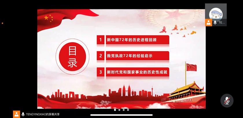 本次会议由滕瀛潇同志主持,会议开始滕瀛潇同志向大家讲述了新中国72年的历史进程。接着讲解了我党执政72年的经验启示以及新时代党和国家事业的历史性成就。