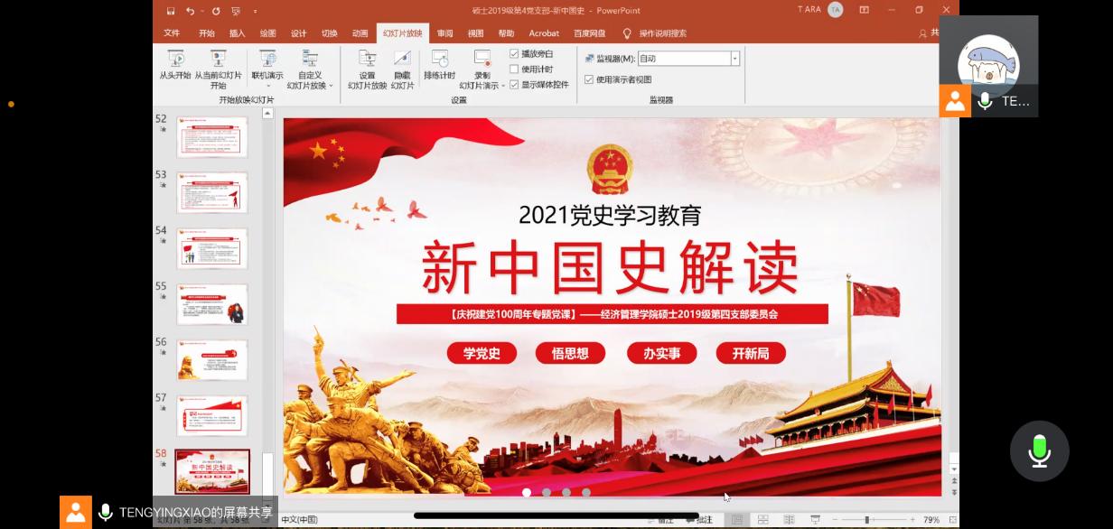 2021年5月18日晚7点,bat365官网登录入口硕士2019级第四党支部开展了云上党组织生活会。本次会议主题为“新中国史解读”,支部全体同志依托腾讯会议平台集中进行了学习。