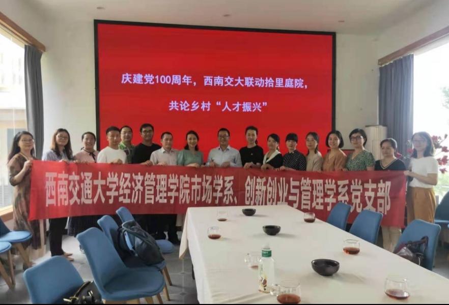 在中国共产党成立一百周年之际,为贯彻“学党史、悟思想、办实事、开新局”的党史学习教育主题,提升党史学习成效,bat365官网登录入口市场学系、创新创业与管理学系党支部于6月10日来到新都区新繁街道汪家村,走进四川源素轻旅文旅科技集团,联合开展院企合作特色党建活动暨乡村振兴研讨会。市场学系、创新创业与管理学系党支部一行16名教师参加了本次活动。四川源素轻旅文旅科技集团的三位创始人董事长李彪、人力资源总监李欣、直营主管李中丽参加了此次活动。