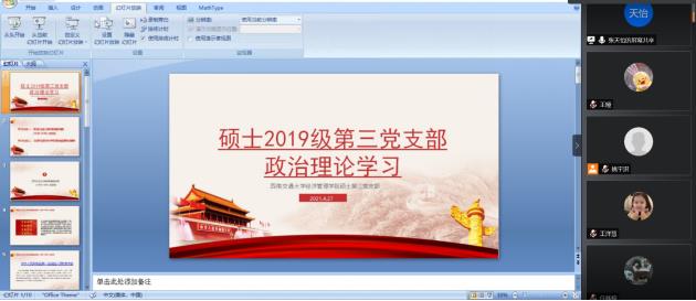 2021年4月27日晚19:30,bat365官网登录入口硕士2019级第三党支部于腾讯会议进行了主题为“党在社会主义革命和建设时期(1949-1978)的历史”的理论学习。学习内容主要分成两个部分,第一部分为“党在社会主义革命和建设时期(1949-1978)的历史”,第二部分为“习近平在清华大学考察时的重要讲话精神”。支部全体成员参与会议,学习由张天怡、谢洁同志主持。