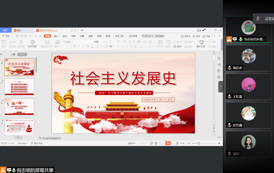 2021年1月7日晚上20点,bat365官网登录入口硕士2018级第六党支部专题组织生活会采取线上的方式,在腾讯会议召开。会议由党支部组织委员倪志明同志主讲,硕士2018级第六党支部全体党员参会。会议围绕主题“四史”学习教育之新中国社会主义发展史进行了学习和探讨。