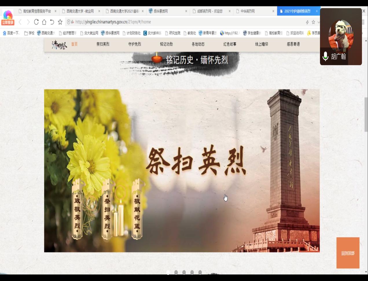 其次,胡广翰同志组织大家参与网上祭扫活动,铭记英雄。带领大家一起了解清明节的本质。清明节本源在于缅怀先祖、知恩报恩。一家一族之祭拜先祖谓之“孝“,一国万民之缅怀先烈方为“魂“。家之”孝“与国之”魂“的统一,体现了中华民族源远流长的家国情怀。生活学习讨论阶段,各党员同志踊跃发言,积极分享学习先烈事迹和观看英雄先烈视频的心得和体会,感受革命先烈艰难曲折的斗争历程与不屈不挠的崇高品质和献身精神,回顾峥嵘岁月,缅怀革命历史。我们要珍惜当前来之不易的、稳定的社会环境,刻苦学习、努力奋斗,懂得今天的幸福生活的来之不易,铭记革命英雄的事迹,传承革命英雄的精神。